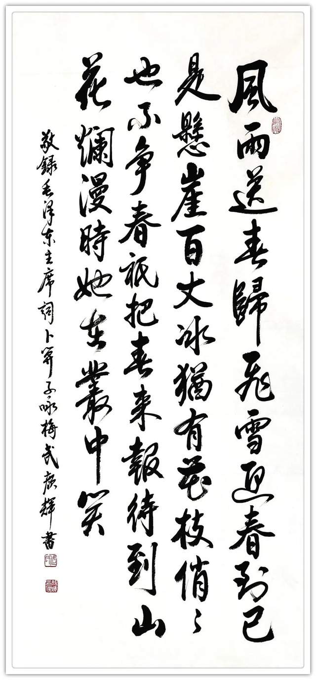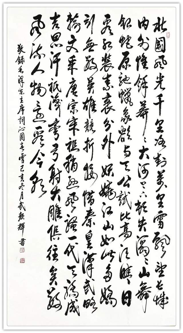 相对于横涂竖抹,大喊大叫,针喷水泼的变形“创新”,他始终不为所动,而是踏踏实实地其继承了晋唐风韵的传统笔法,其结字之端庄厚重、浑然大气、骨力尽现、力透纸背,笔姿之爽朗洒脱,让人心旷神怡;其线条的曲直、长短、粗细各有妙处,最具价值所在就是创作之精诚和技法之娴熟流畅;其点画如铁画银钩,表现了一种刚毅倔强,风流潇洒之气,运笔的脉络交代得也十分清楚;其结构庄重优美,肥瘦并施,重心安稳,神采抑扬适度,俊逸典雅,看似平常却奇崛,观之可见,柔中显刚劲,遒逸露姿媚,给人以突出、稳健、灵动的艺术享受,亮点纷呈,特点突出,个性鲜明,精诚所至则能动人,虽是一纸静态画面,却完美凸现其动态的韵律;其势之大、其力之沉均表现出其功力所在,渗透着力与美的张扬和平衡,生动表现了作者刚直、爽利、豪放的性格和独到的艺术风格。