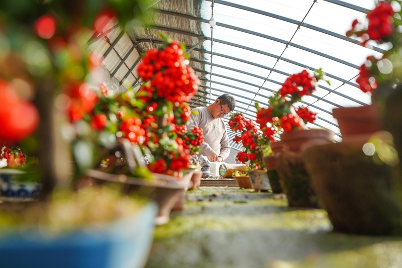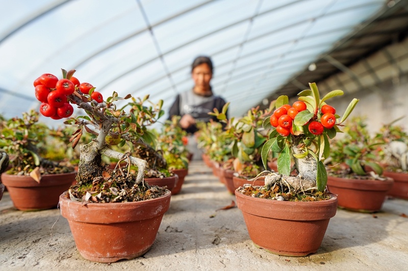 据了解,该合作社选取蔷薇科常绿植物火棘作为盆景素材,探索和优化火棘微型盆景培养制作流程,形成了一套成熟的快速培养方法,该园已培养火棘微型盆景超过10万盆,主要通过网络线上销售,产品以快递方式销往全国各地,形成了火棘微型盆景“大产业”,助力农民增收致富。