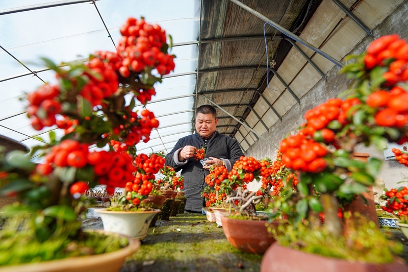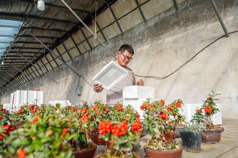 滦南县长凝镇西城子村森琪苗木种植专业合作社员工在整理火棘微型盆景,准备装箱外运销售。张永新 摄