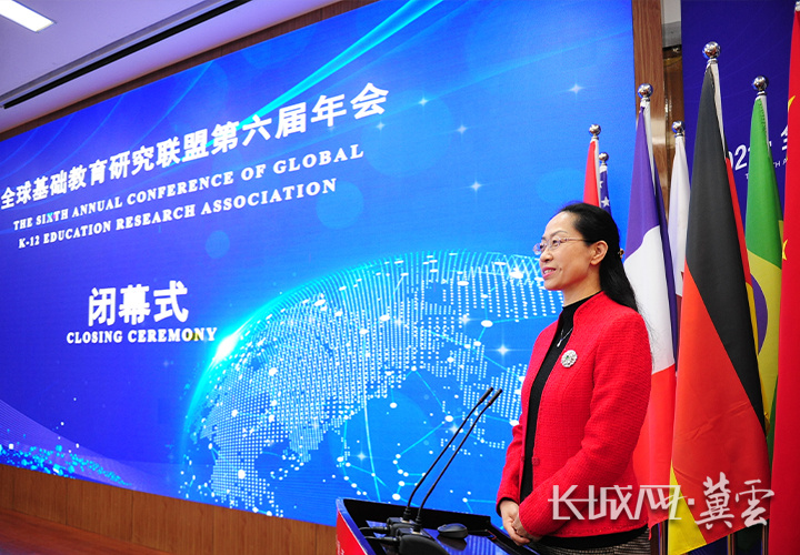裴红霞在“全球基础教育研究联盟”年会上发言。石家庄外国语学校 供图