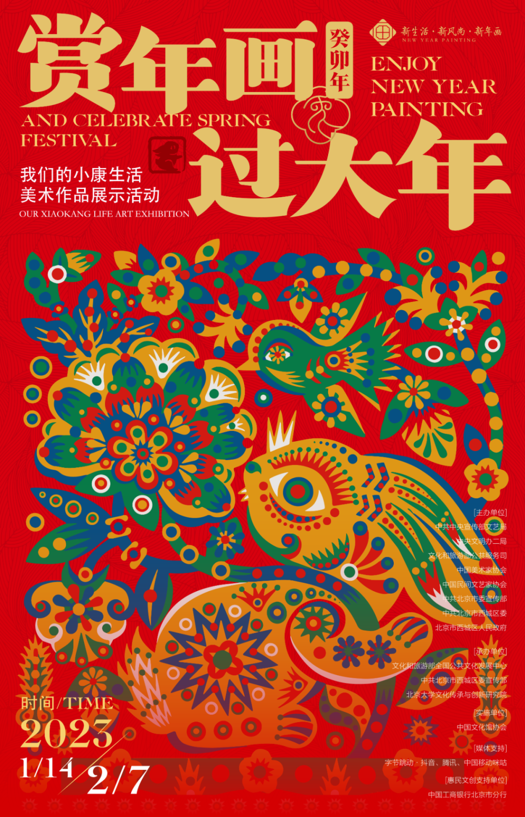 由中共中央宣传部文艺局、中央文明办二局、文化和旅游部公共服务司、中国美术家协会、中国民间文艺家协会、中共北京市委宣传部、中共北京市西城区委员会、西城区人民政府联合主办的“赏年画 过大年”北京市主场系列活动于2023年1月14日,在大栅栏(北京坊)地区拉开帷幕。该活动是推动中华优秀传统文化创造性转化、创新性发展和振兴中国传统节日的重要载体,是“新生活·新风尚·新年画”我们的小康生活主题美术创作征集展示活动的集中体现,也是北京市春节期间组织开展的重要品牌文化活动之一。活动自开展以来在全国各地得到积极响应。