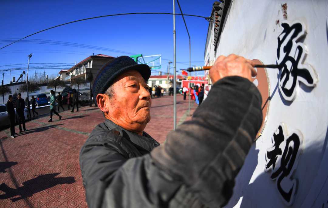 在迁安市沙河驿镇李店子村,老党员张义正在为家风广场绘制文化墙。