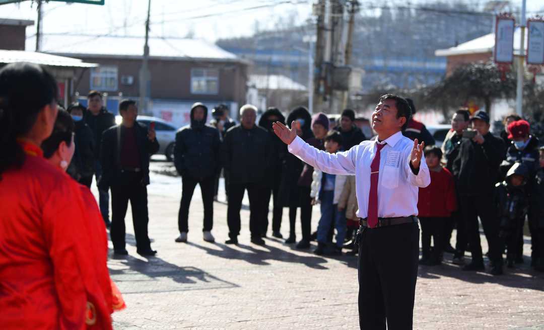 在迁安市沙河驿镇李店子村家风广场,文艺志愿服务队正在表演节目《何书记吃元宵》。