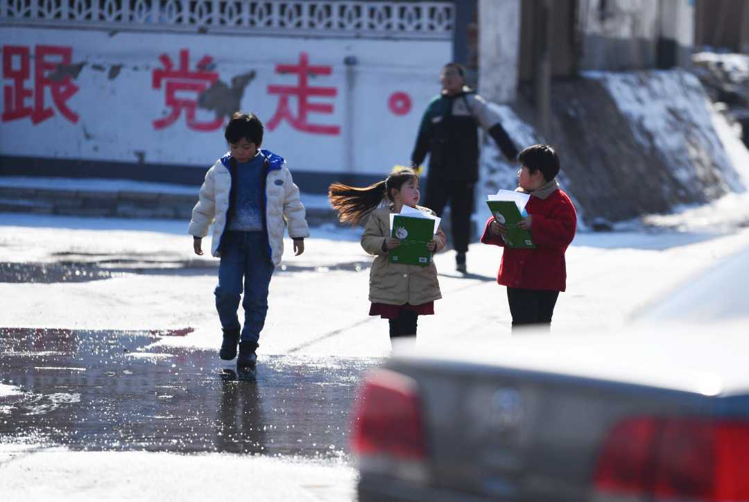 在迁安市沙河驿镇李店子村,孩子们从乡村复兴少年宫上完绘本课后回家途中。