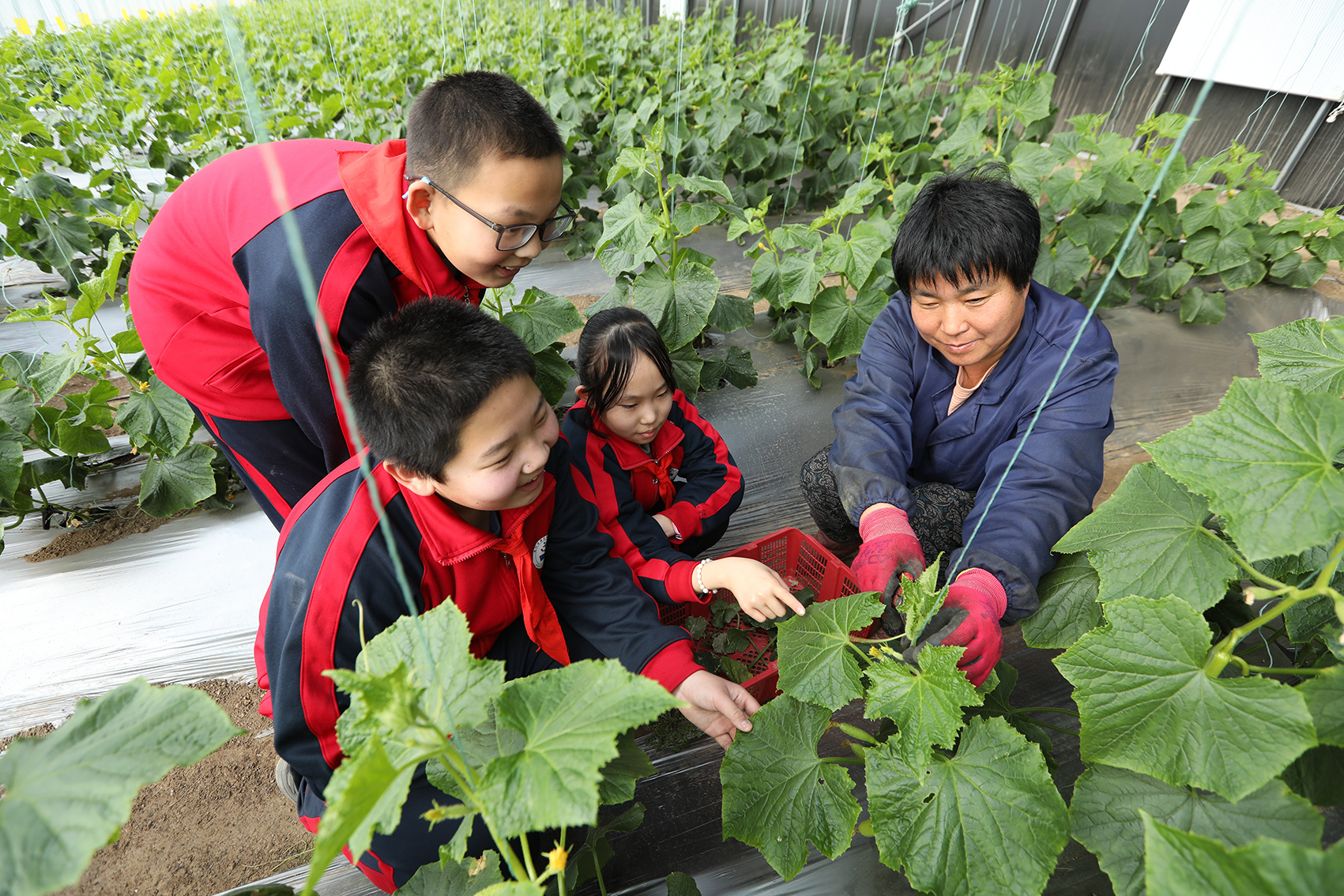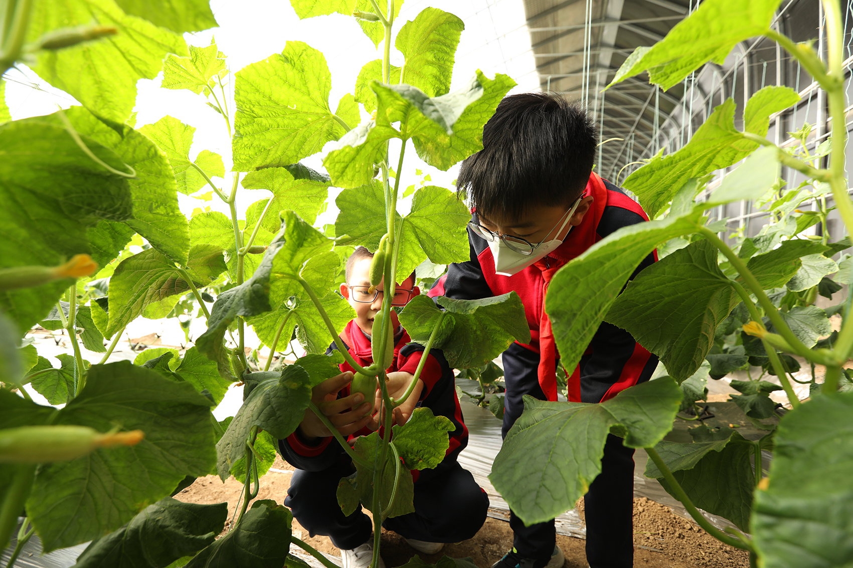 蒋辛屯镇五百户村农业大棚内,学生们学习体验农作物的种植,体验传统春耕的乐趣。