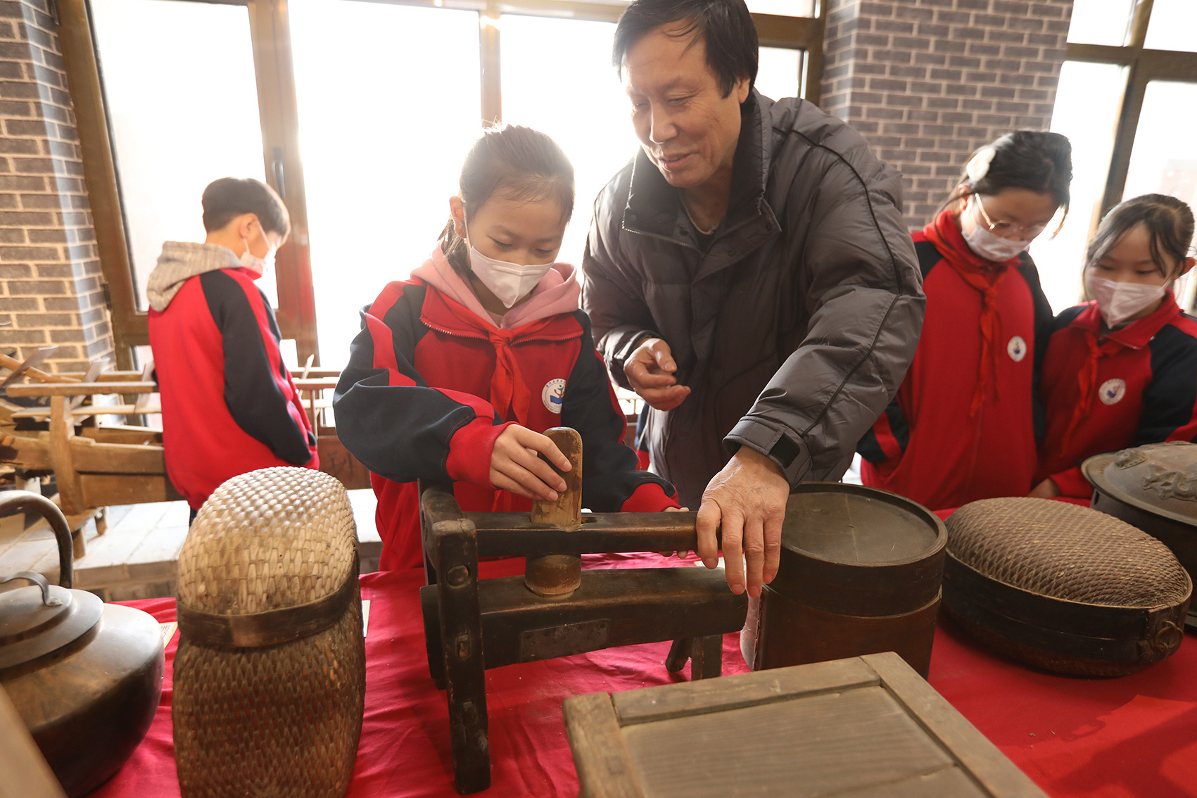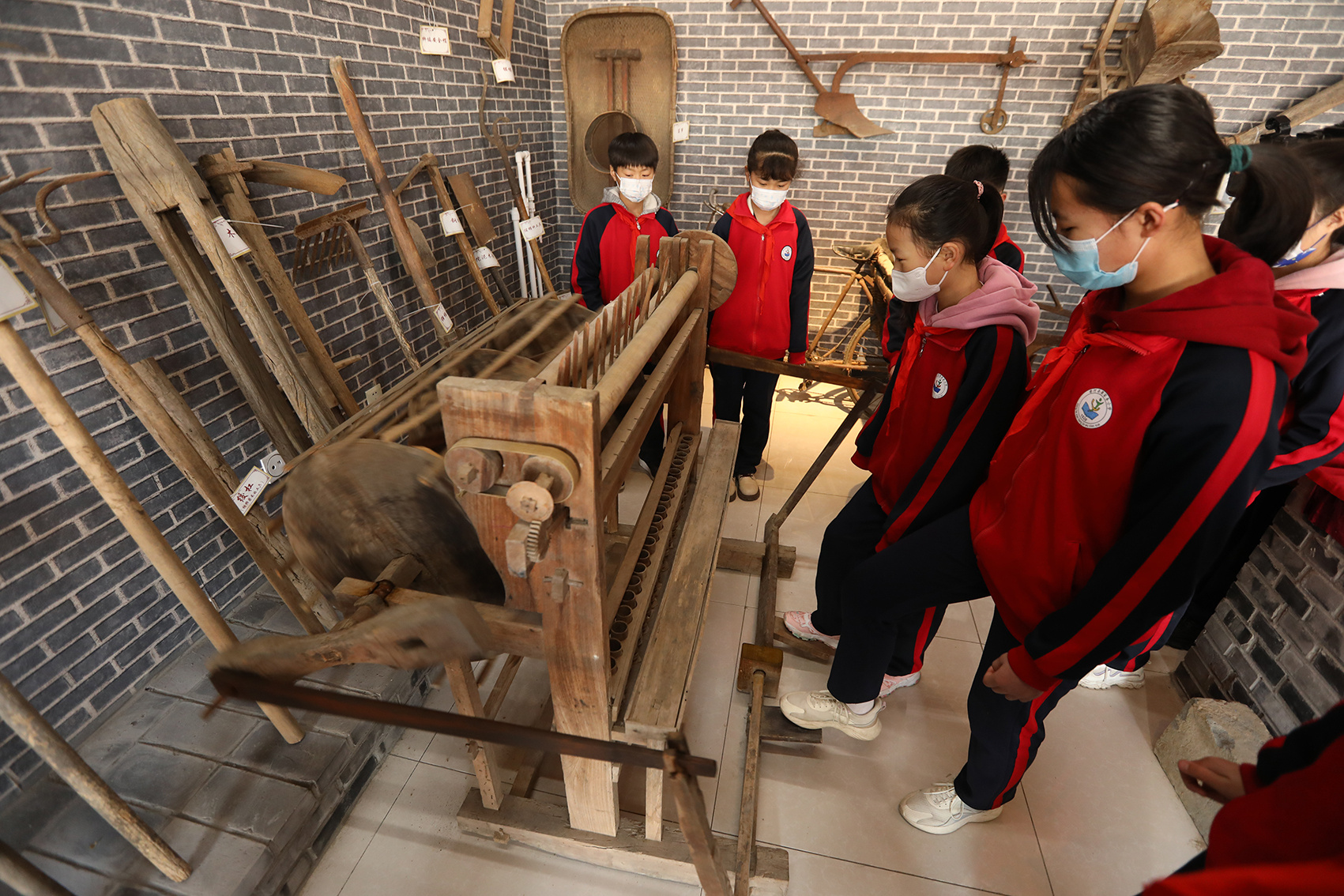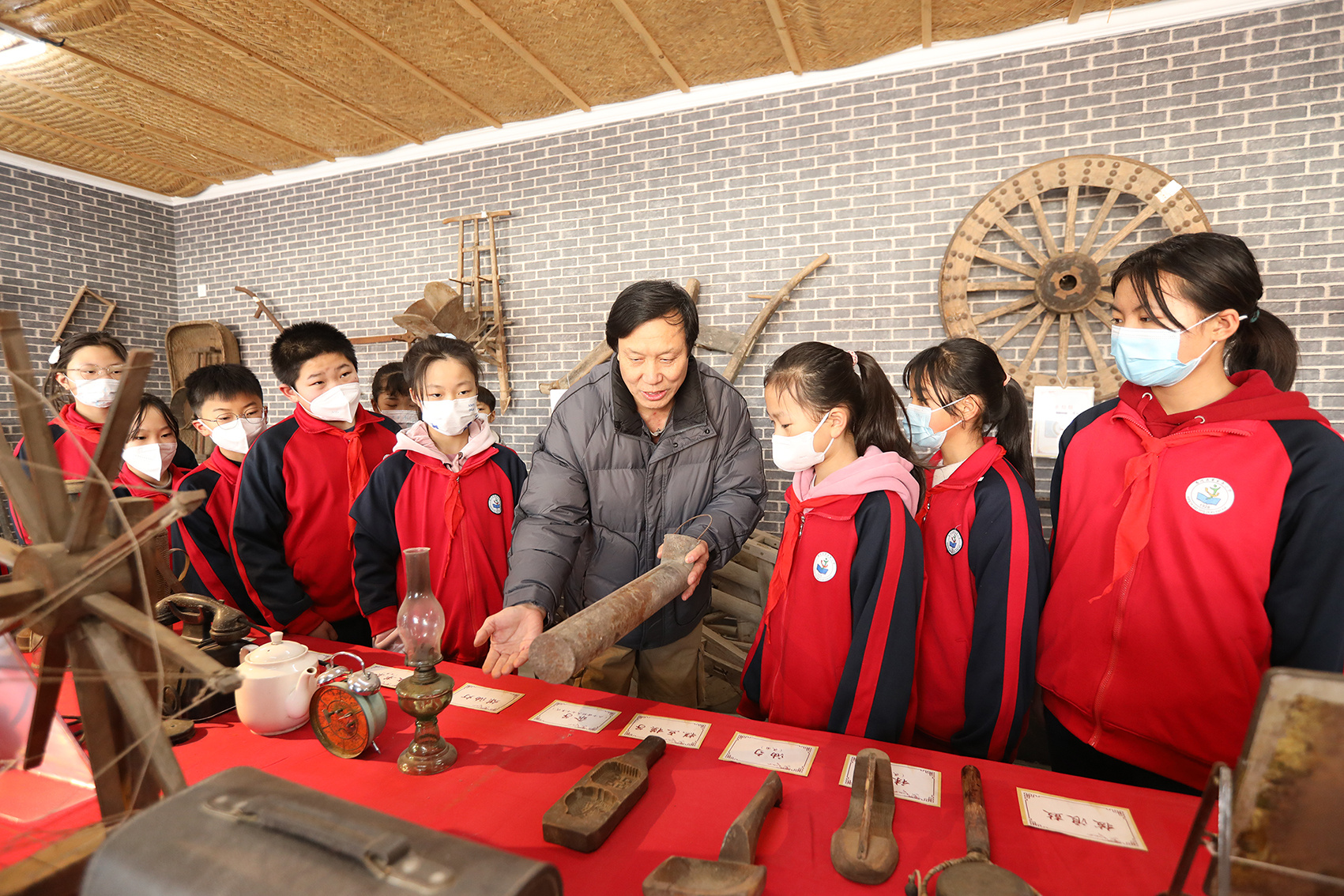 2月15日,河北廊坊香河县蒋辛屯镇梁家务小学组织学生们走进蒋辛屯镇头百户村的农耕博物馆,在讲解员的带领下参观古代农业器具,学习传统农业文化。