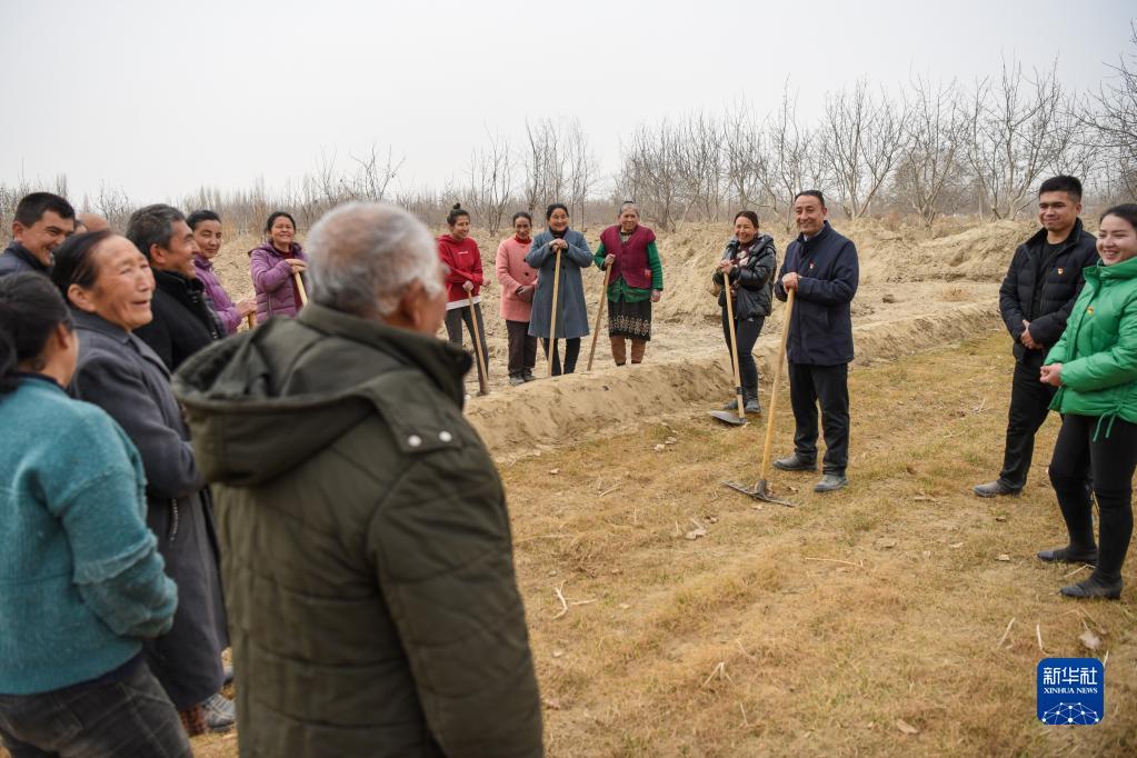 2月20日,在新疆和田地区策勒县巴什玉吉买村,买买提依布热依木·买买提明(中)和村民一起整理土地,为春耕生产做准备。 新华社记者 丁磊 摄