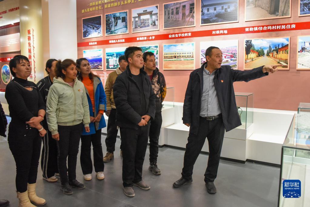 2月20日,在新疆和田地区策勒县巴什玉吉买村的民族团结馆,买买提依布热依木·买买提明(右一)向村里的年轻人介绍策勒县的变化。 新华社记者 丁磊 摄