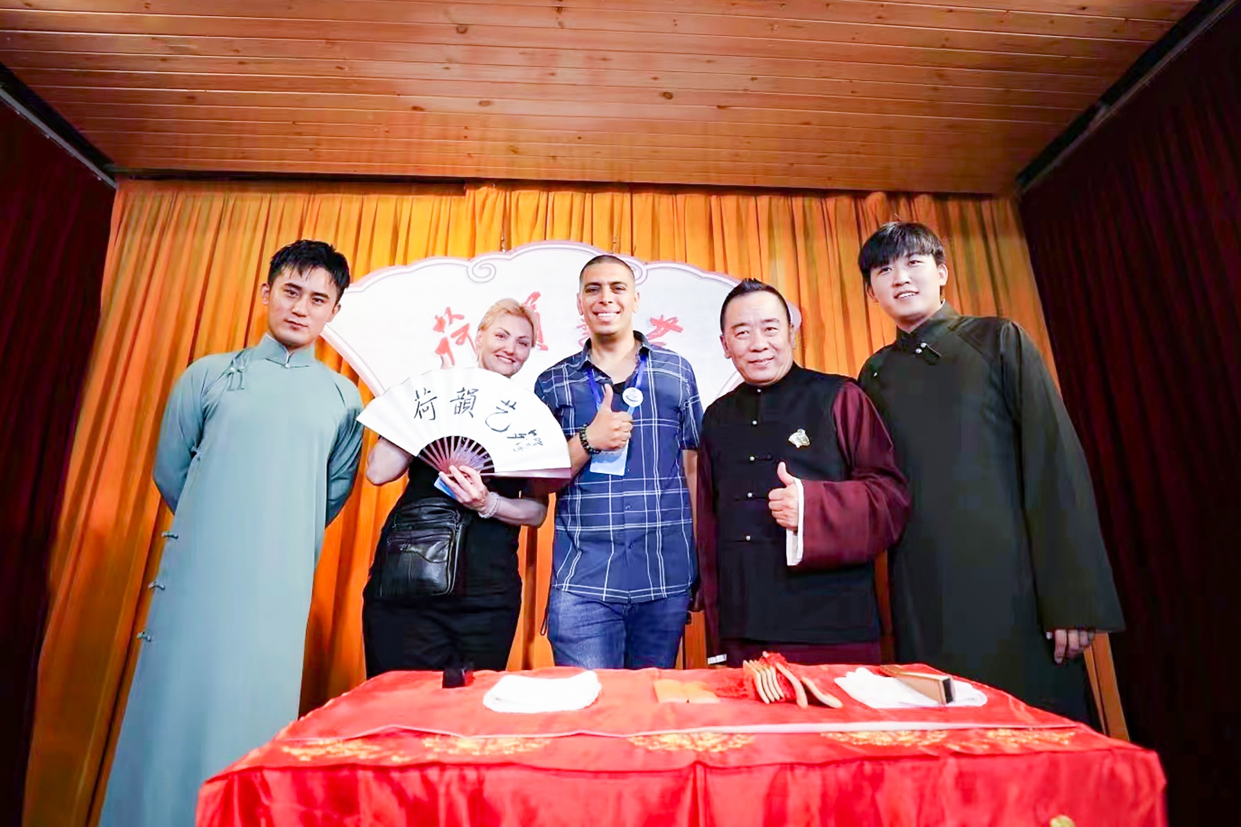 尚胜利(右二)和在华外籍人士交流相声表演。孟龙 摄
