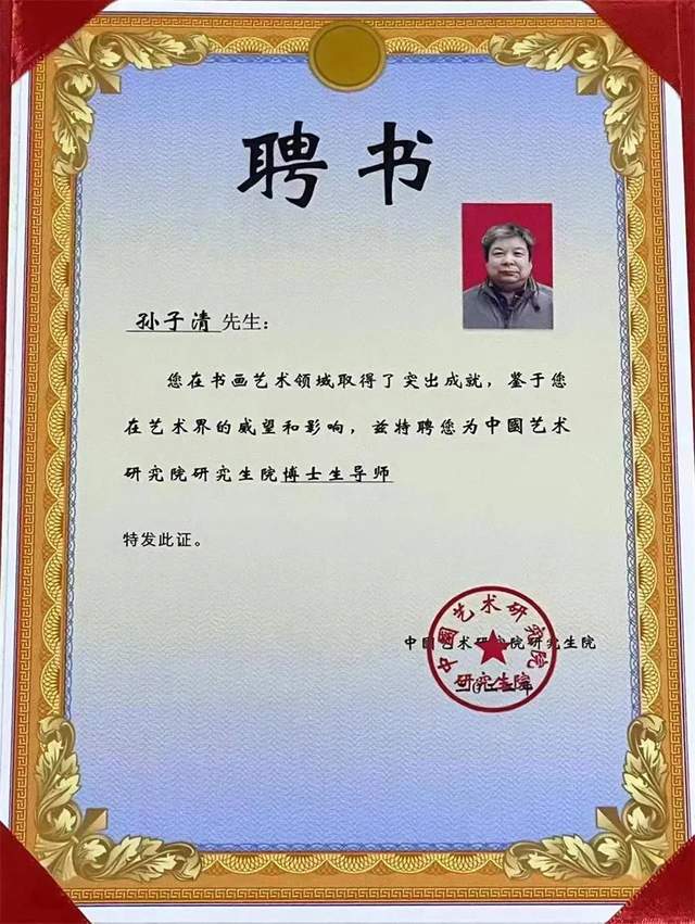 孙子清,中国艺术研究院研究生院博士生导师,中国美术家协会会员、香港美术家协会副主席、国家一级美术师,潘天寿,李可染第三代传人!原名孙存现,共产党员,1966 年生,山东鄄城县孙膑后人。实力派画家。1982 年先后拜师:花鸟类著名画家、装裱家、收藏家、工艺美术大师冯增木先生;山水类著名画家潘天寿、李可染的学生苏增安先生。又多次求教著名画家张彦青、刘鲁生先生,具有很深的造诣。现为香港注册的毛泽东书画研究院执行院长、中国文联中国企业文化促进会企业艺术家工作委员会委员、中国王羲之书画艺术研究院研究员、孙膑文化研究会常务理事、国际齐白石艺术中心常务理事、文化部北京大有乾景书画院副院长。2014 年,在石家庄举办的中国当代书画 500 强比赛中荣获 59 名,2015 年被授予“全国百位优秀书画家”荣誉称号并荣获“全国百位书画传播大使”称号。2014 学画了《万山红遍》和师爷的风格有些不同,2015 年又首创完成了万山红遍系列 6 幅:《万山红业》《万山龙吟》《万山奔腾》《万山欢笑》《万山一心》《万山太平》。2015-2018年完成《中华太平钓鱼岛》7 幅,2019 年七幅《祖国山河万年青》系列创作中!2017 年被全国十大网站共同推举全国十位最具影响力的艺术家,还被推举参加有十位书法家和十位画家参加的一带一路推荐活动,2019 年被评为中国非遗艺术文化传承人,又被评为十位共和国万岁献礼的书画家之一,和国际孔子艺术奖,2019 年成为首批入国家档案局入档的艺术家。曾参加评为改革开放 40 年 40 家!建国 70 年 70 家!2022年评上世界文化艺术终身成就奖!