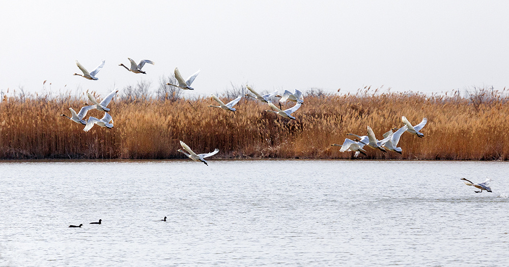 3月10日,数十只小天鹅在河北省衡水湖落脚休憩。湖面碧波荡漾,小天鹅时而在水中翩翩起舞,时而在空中展翅飞翔,形成一道靓丽的风景线。