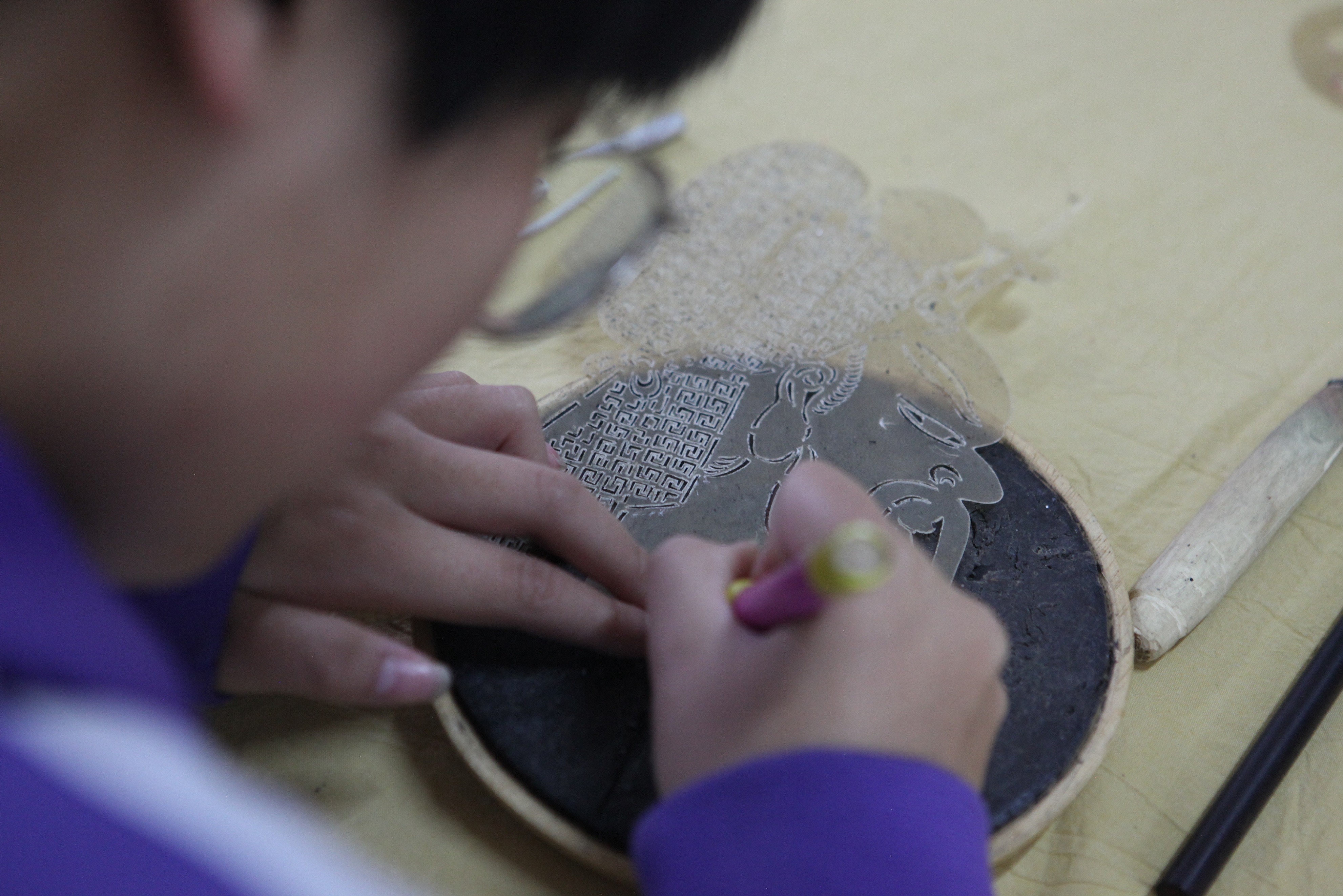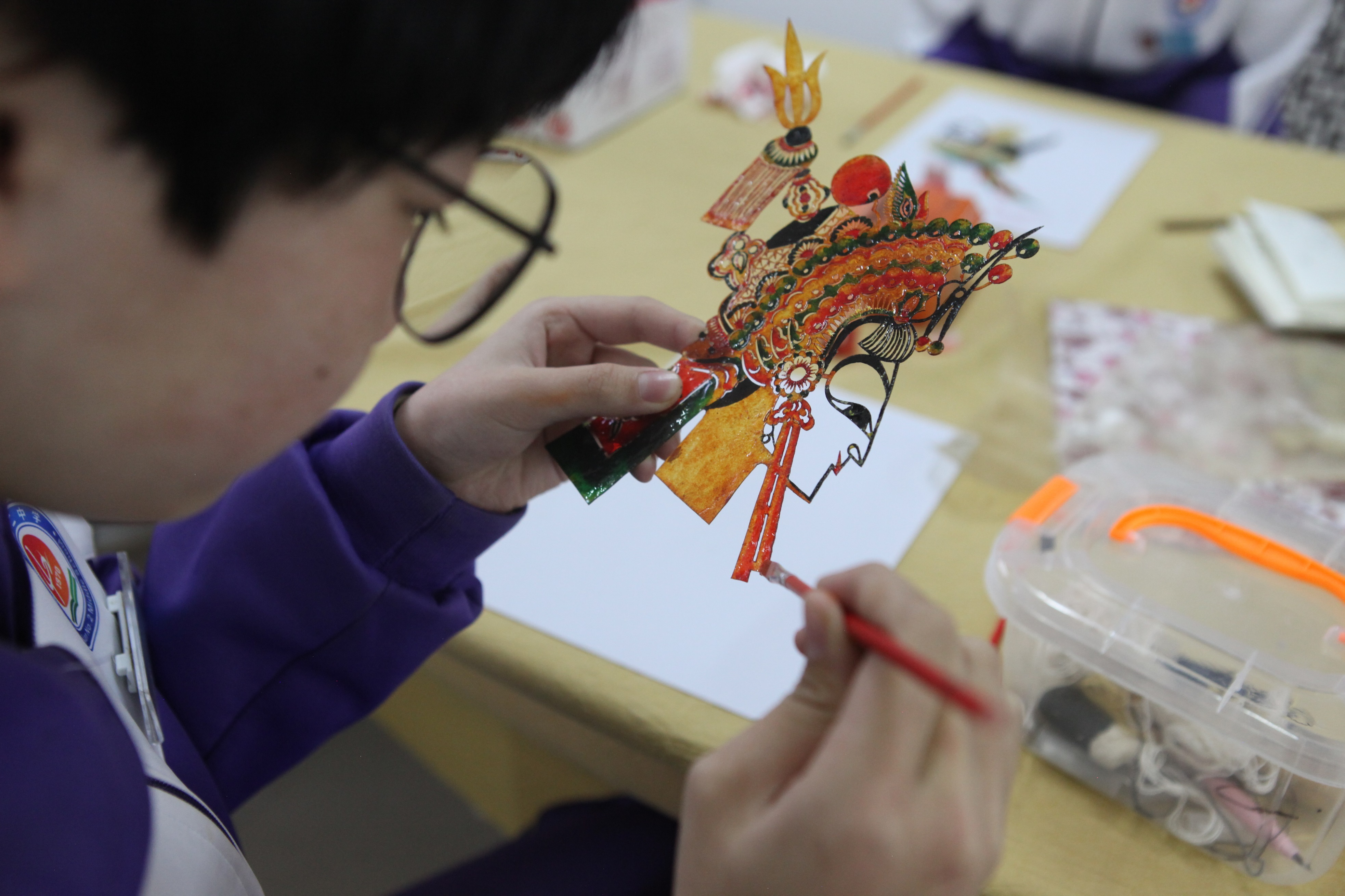 图为老师正在教学生如何给皮影上色。 张悦 摄