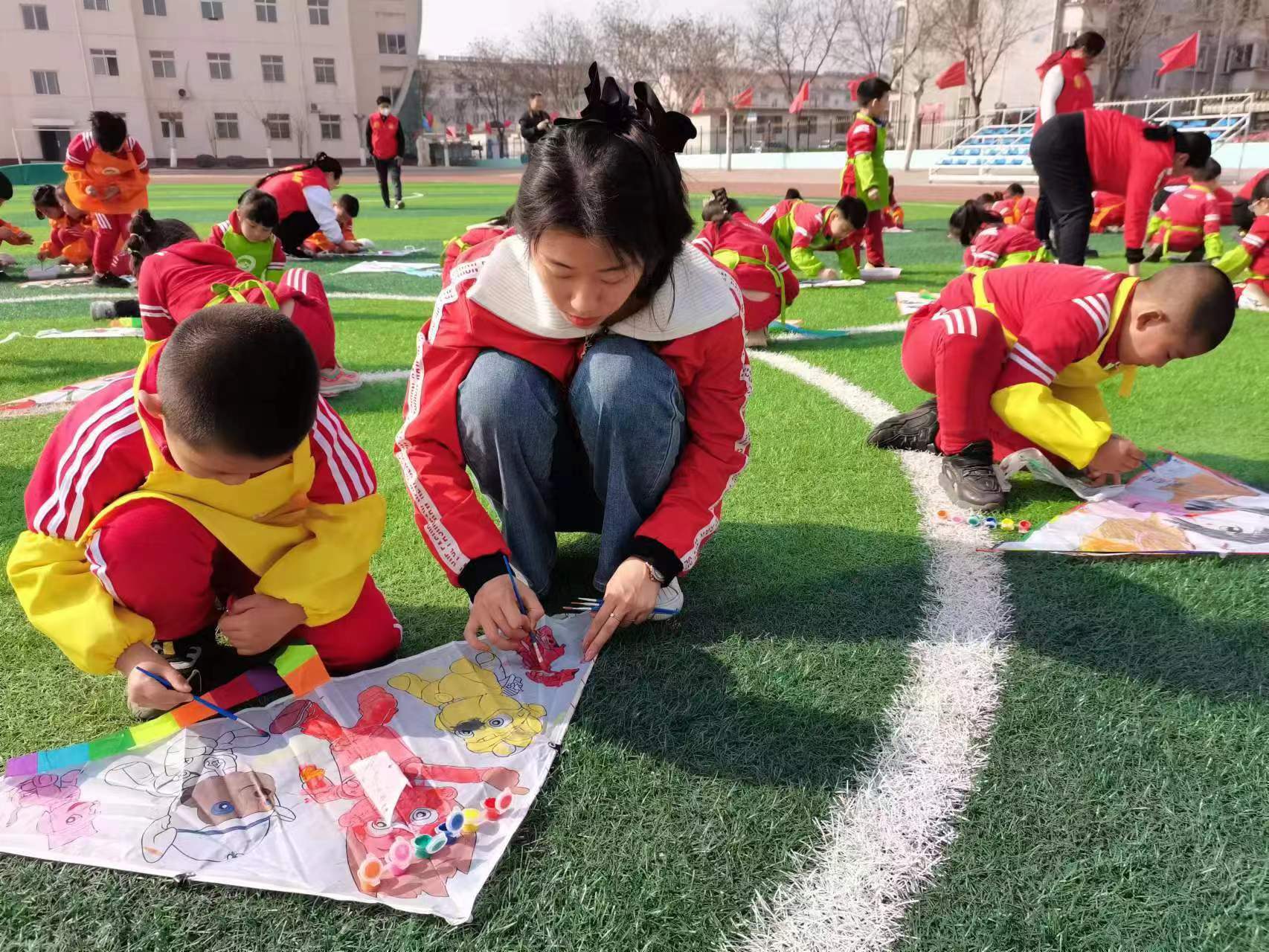 河北滦州响嘡街道研山幼儿园师生在操场上制作风筝。