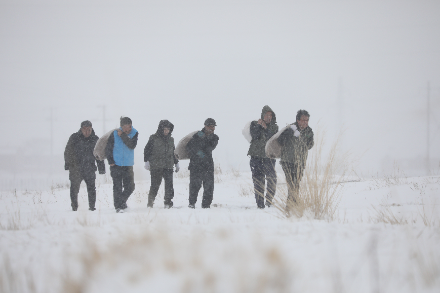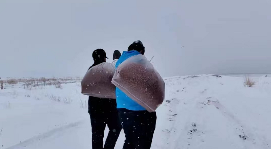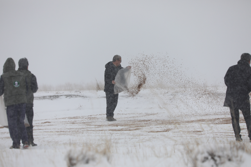 遗鸥保护协会工作人员为遗鸥雪中送食。