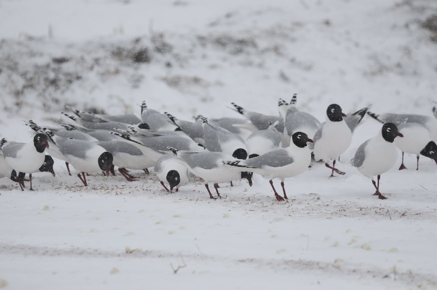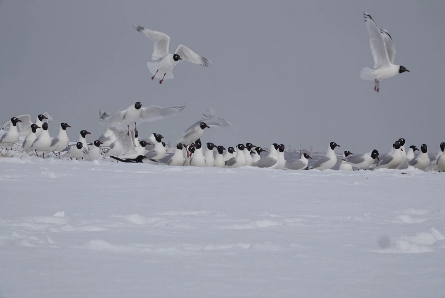 2023年4月3日,经过一天降雪,河北省张家口市康保县积雪厚度达9厘米。回归康巴诺尔湖的1000余只遗鸥觅食困难。遗鸥保护协会及时启动中国绿色碳汇基金会和中国春秋航空公司康保遗鸥救助项目,开辟一处雪地投食场,为遗鸥投喂干面包虫60斤,馒头50斤,部分解决了遗鸥因饥饿而导致体质衰弱或死亡现象的发生。