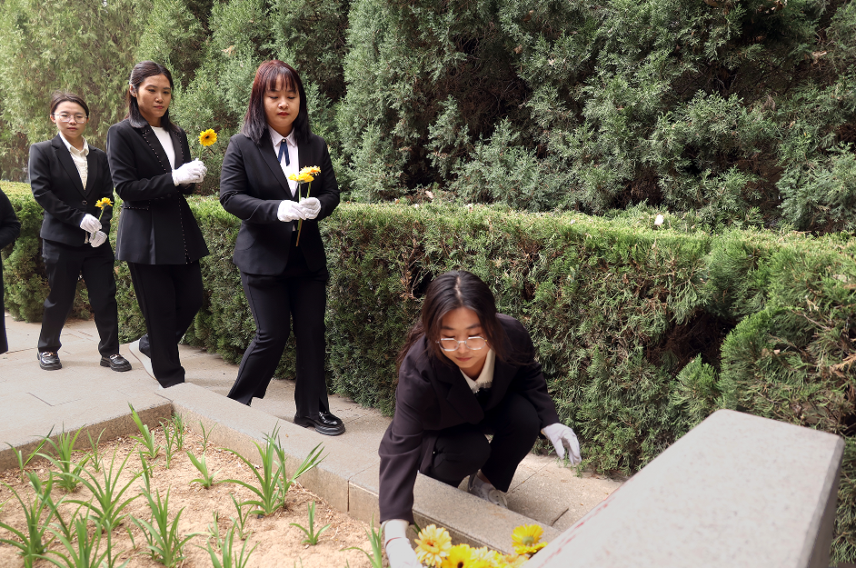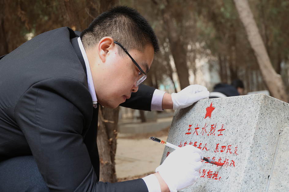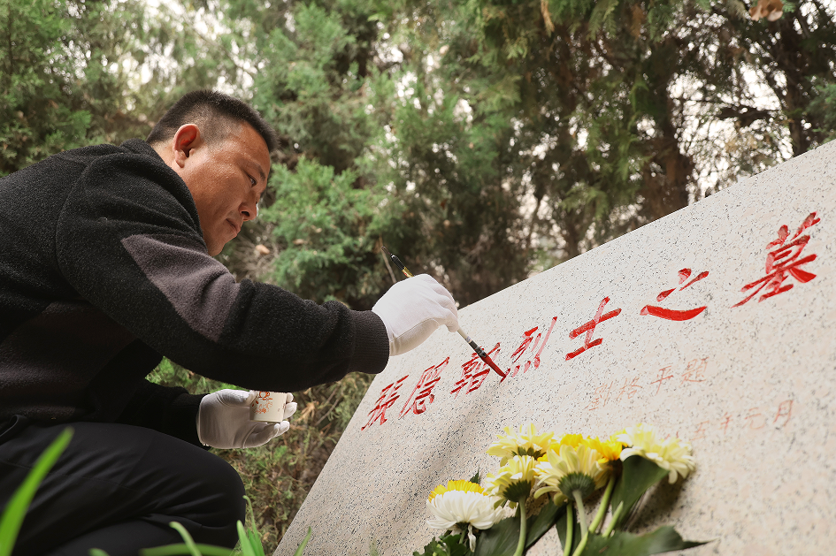 在烈士墓地,老师们庄重肃穆地拿起手中的笔,用毛笔蘸上红漆,一笔一画将墓碑上的字迹描画清晰,每一处笔画的描摹,都是对先烈事迹的怀念,每一个细小的动作,都凝聚着对大无畏牺牲精神的崇敬。