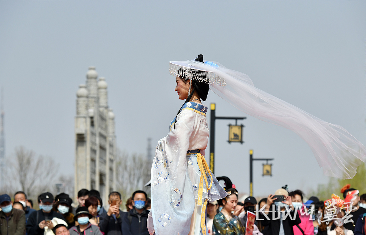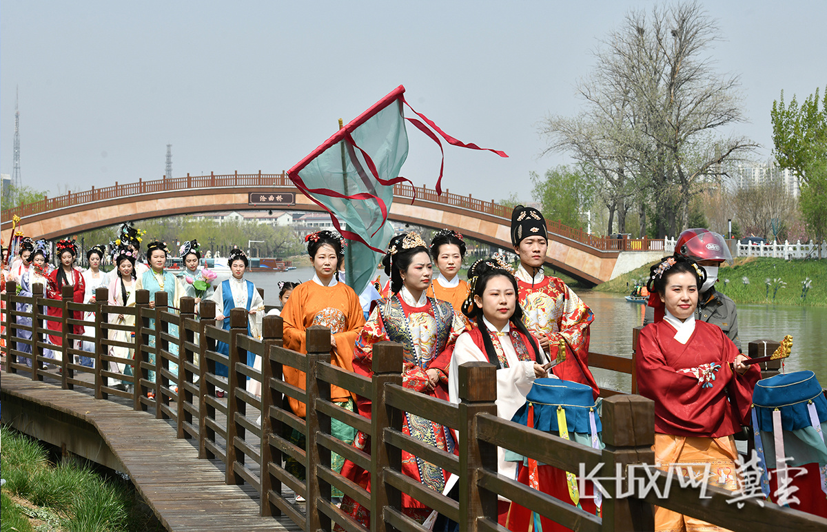 演员着汉服在百狮园运河栈道巡游。苑立伟 摄