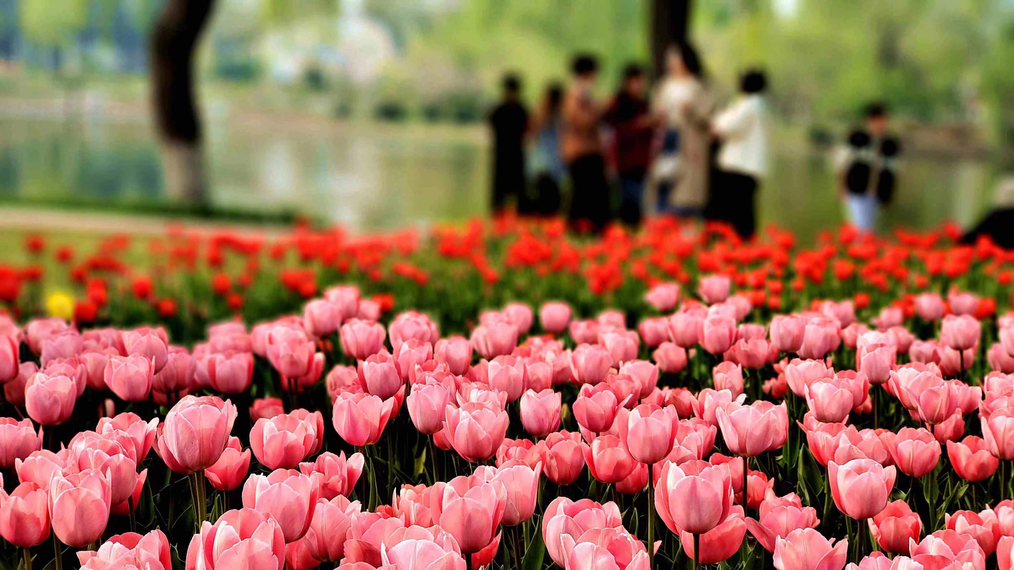 步入各展区,放眼望去朵朵郁金香汇聚成一片彩色花海,有的皎洁如玉,有的明丽透亮,有的纯正馥郁,其花卉刚劲挺拔,叶色素雅秀丽,花朵端庄动人,缤纷绚丽的郁金香花海与波光粼粼的湖面交相映衬,花影旖旎、绿意盎然,前来游玩的市民纷纷驻足寻找最佳角度拍照打卡,春花与游人共同绘就一幅和谐优美的自然画卷。