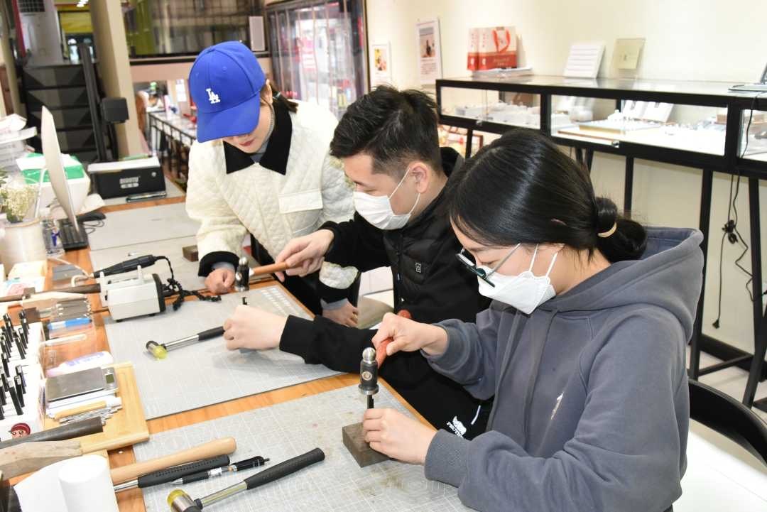 游客在印冀文创手作工艺创意集合馆内制作错金银非遗工艺手工对戒。夏子琪 摄