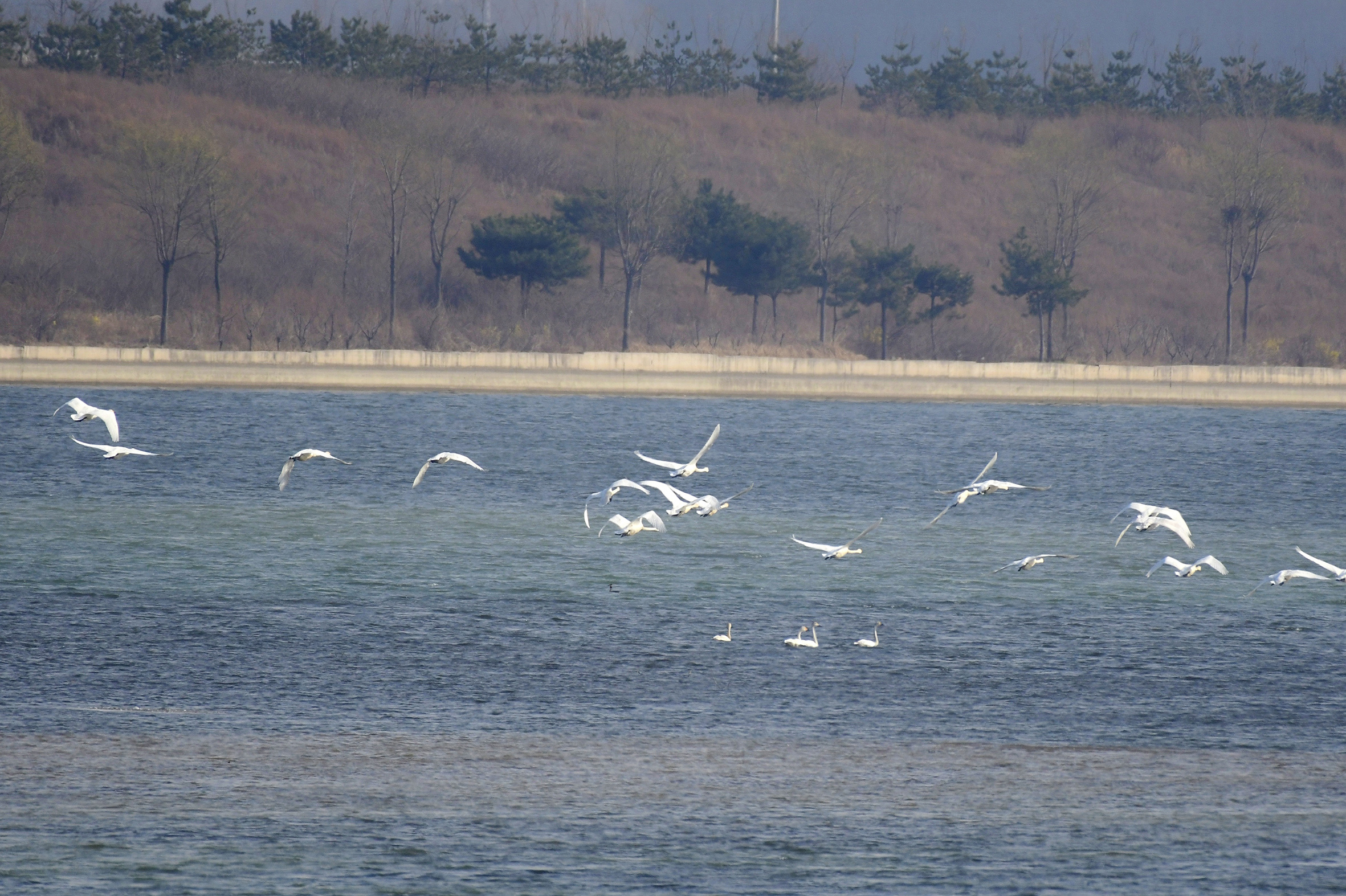 国家二级保护动物白天鹅在迁安市黄台湖水面上飞翔。李晓松 摄