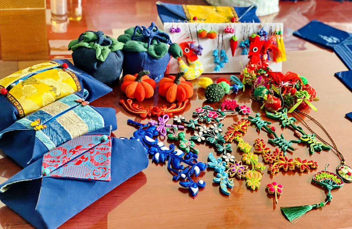 中式服装需要搭配古韵的盘扣,有的还要搭配中国风耳饰、手包,从设计制作王祥娟亲力亲为,渐渐拓宽布艺作品范围,做的种类越来越多。