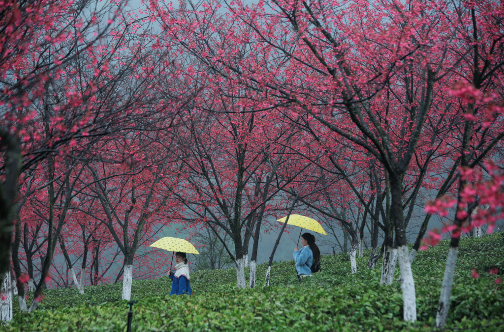 在湖南省郴州市苏仙区的高椅岭樱花茶场里,春意正浓,茶绿樱红,阳光正好,人似画中游。(来源:苏仙区融媒体中心)