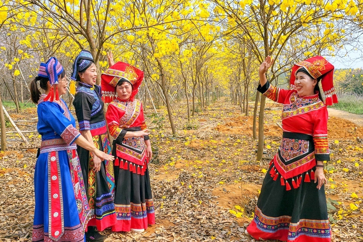 在广西壮族自治区南宁市横州市,黄花风铃绽放成了一片金色的海洋。(来源:横州市融媒体中心)