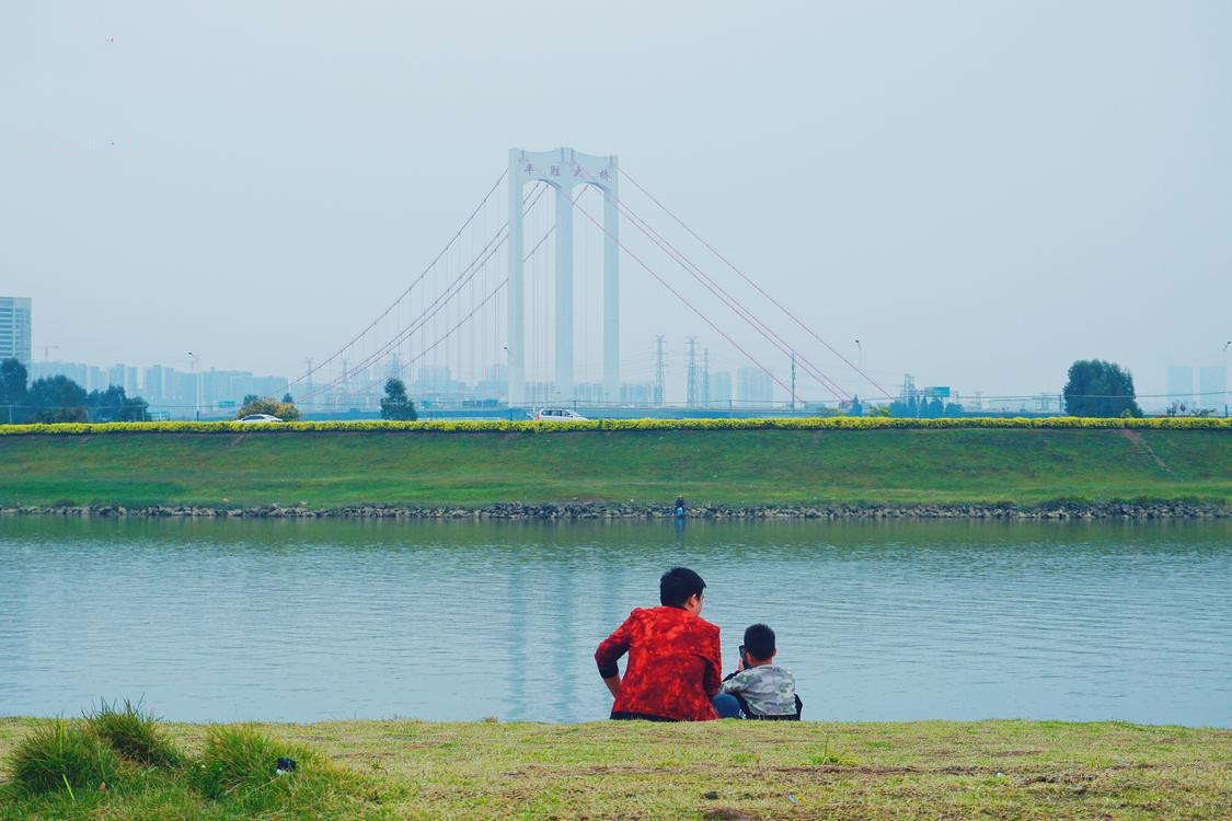 在广东省佛山市南海区,家长和孩子在河道旁相偎而坐,欣赏春日的美景。(来源:南海区融媒体中心)