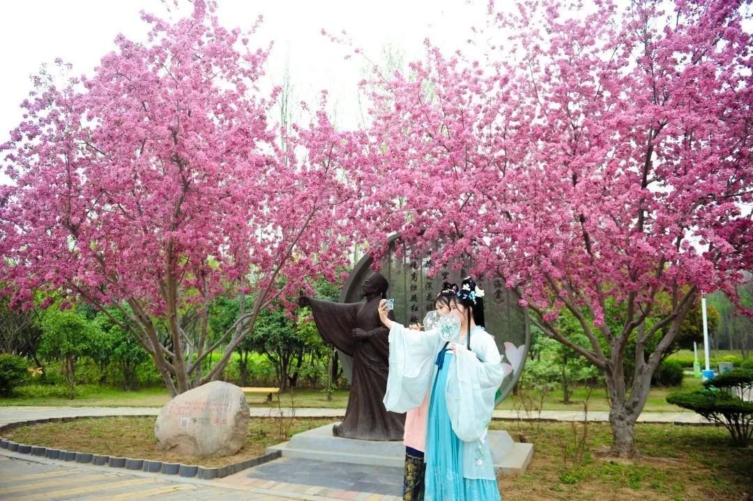 在河南省郑州市中牟县,身着古装的游客在郑州绿博园中留影。(来源:中牟县融媒体中心)