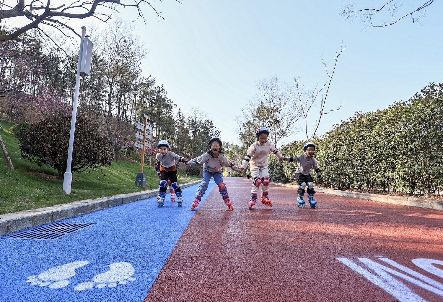 在江西省九江市湖口县台山公园,小朋友正在踏春健身,享受运动带来的快乐。(来源:湖口县融媒体中心)