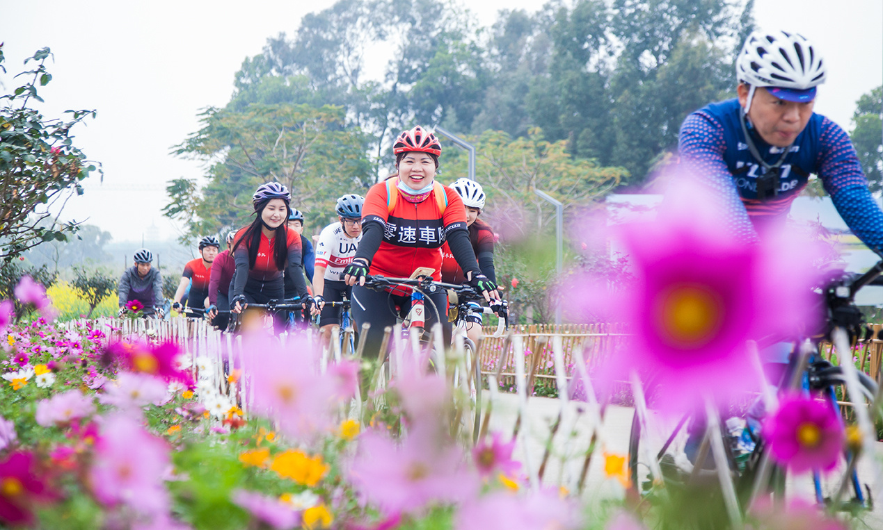 在广东省东莞市桥头镇,骑行爱好者正在花海中骑行,纵享春天的芬芳。(来源:桥头镇融媒体中心)