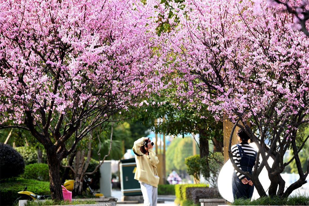 在江西省赣州市蓉江新区滨江公园,盛开的樱花浪漫绚烂、粉若云霞,吸引众多市民游客前来踏青赏花。(来源:蓉江新区融媒体中心)
