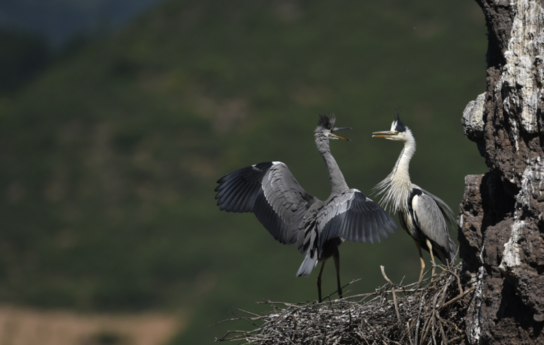 苍鹭是国家二级重点保护野生动物,头、颈、脚和嘴均甚长,因而身体显得细瘦。其上半身主要为灰色,腹部为白色。苍鹭的喉音较为深沉,发出的呱呱声极似鹅的叫声。以小型鱼类、泥鳅、虾、蜻蜓幼虫、蜥蜴、蛙和昆虫等动物性食物为食,觅食最为活跃的时间是清晨和傍晚。常成对或成小群活动,迁徙期间和冬季集成大群。