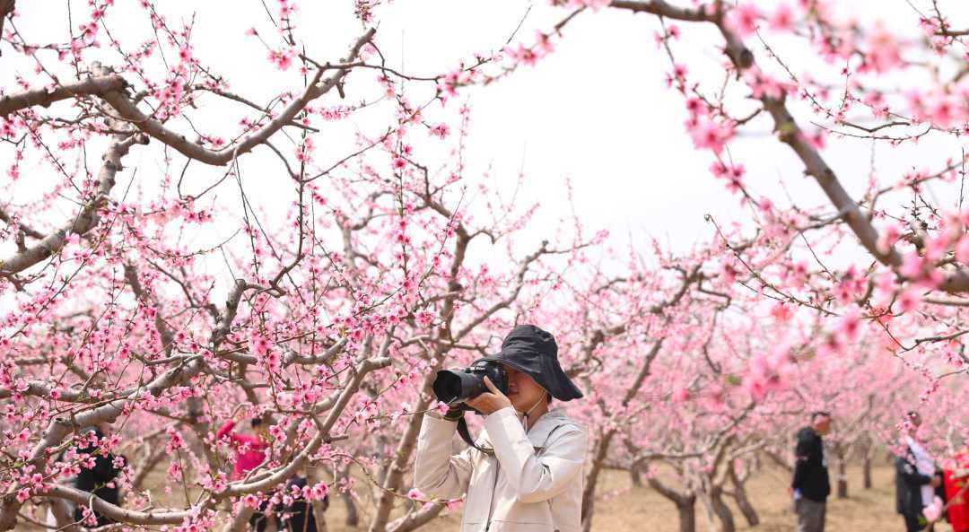 摄影爱好者在廊坊市安次区葛渔城镇林海桃源景区拍摄桃花。