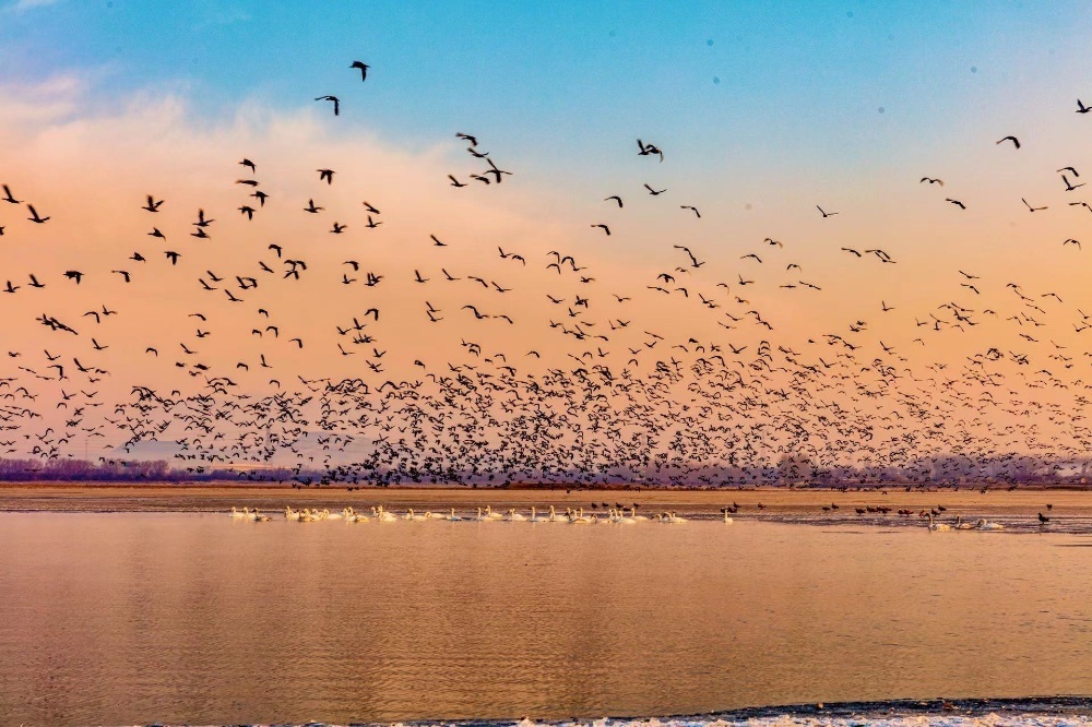 成群的赤麻鸭在黑山底水库上空翱翔。李彦学 摄