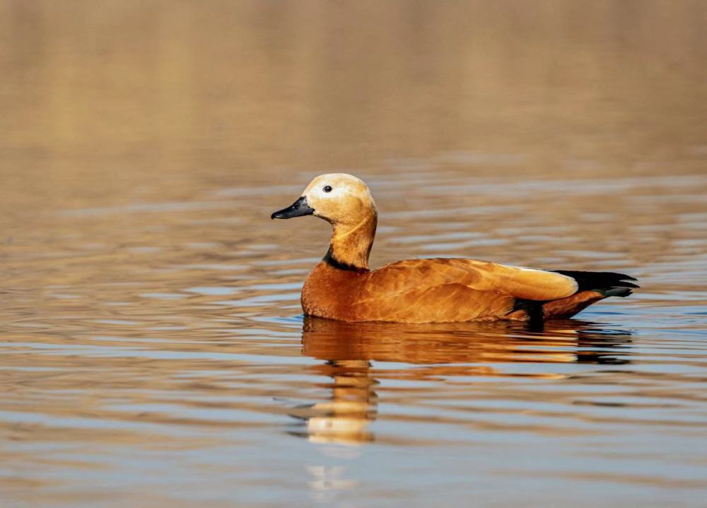 赤麻鸭,体型较大,体长51厘米至68厘米,体重约1.5kg,比家鸭稍大。全身赤黄褐色,翅上有明显的白色翅斑和铜绿色翼镜;嘴、脚、尾黑色;雄鸟有一黑色颈环。飞翔时黑色的飞羽、尾、嘴和脚、黄褐色的体羽和白色的翼上和翼下覆羽形成鲜明的对照。栖息于开阔草原、湖泊、农田等环境中,以各种谷物、昆虫、甲壳动物、蛙、虾、水生植物为食。