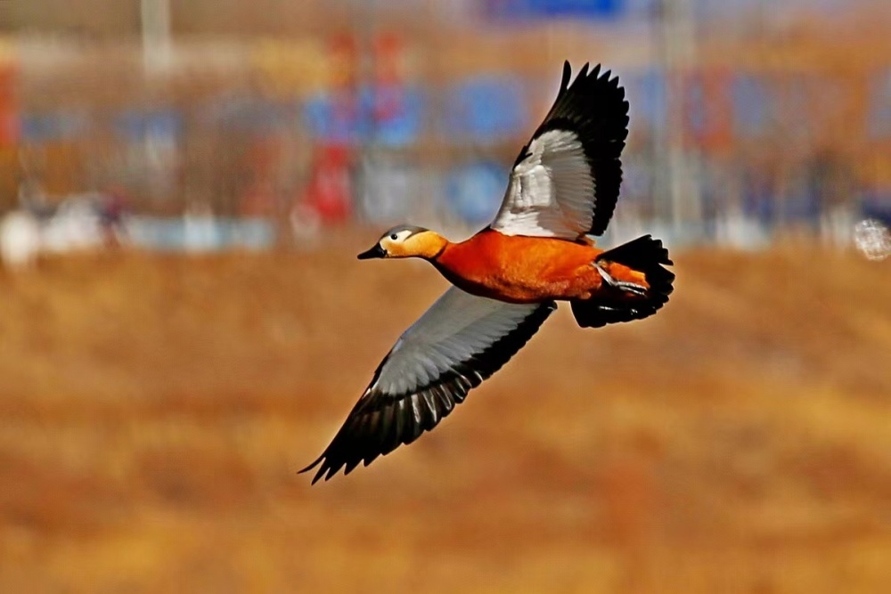 赤麻鸭在康巴诺尔湖上飞行。温利 摄