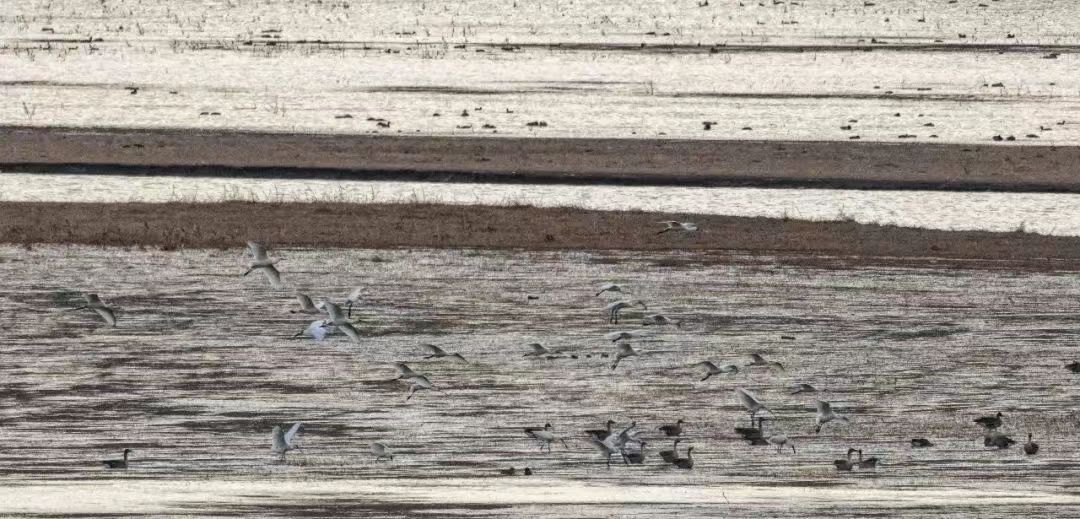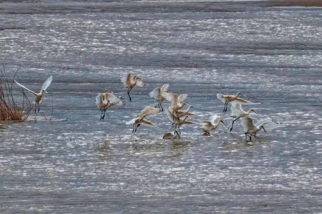 黑面琵鹭数量稀少,属全球濒危物种之一。黑脸琵鹭每年3月至4月到达繁殖地,10月至11月离开繁殖地前往越冬地,多以未受污染的小鱼、虾、蟹、昆虫及软体动物等为食,警觉性极高。据了解,此次有这么多的黑脸琵鹭“歇脚”四合永林区还是首次,实属难得。春日里,阳光明媚,成群的候鸟在水面上展翅起舞,嬉戏觅食,静谧的水面与灵动的鸟儿相映成趣,勾勒出一幅美丽生态画卷。