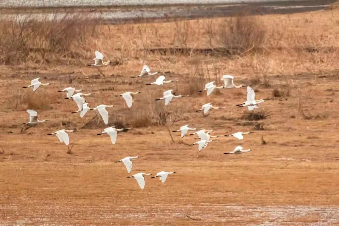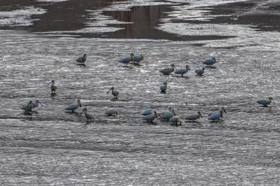 有“黑面天使”之称的国家一级保护动物——黑脸琵鹭成群结队出现在四合永林区。吴枫 摄