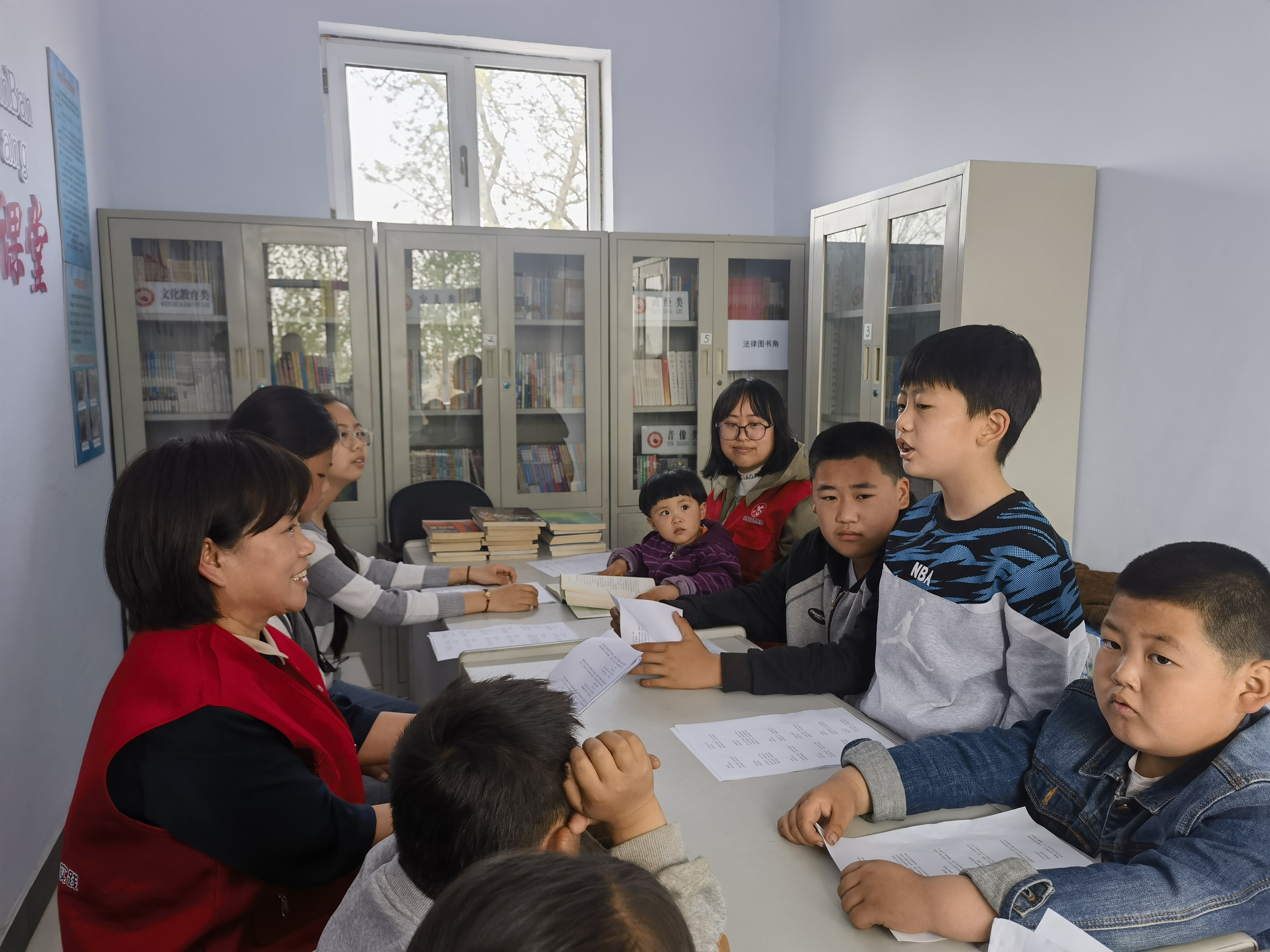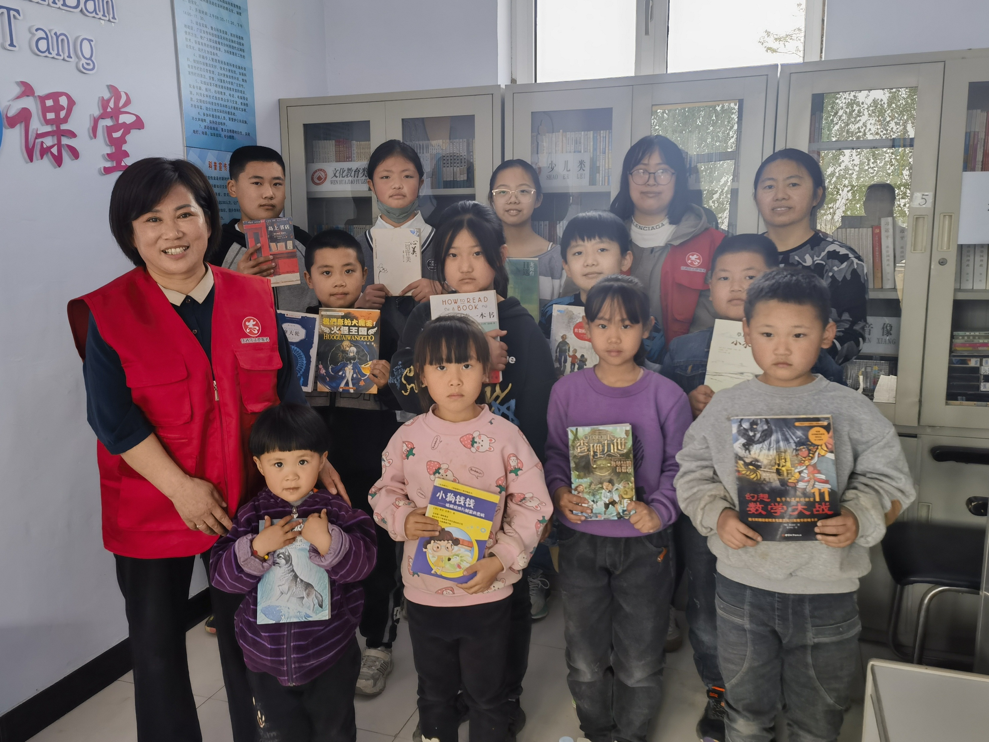 在唐山市丰润区任各庄镇一农家书屋,志愿者们为孩子们赠送图书。