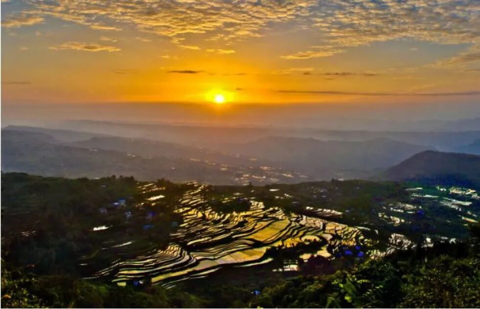 高山连片的茶园风吹绿浪,云雾缭绕的森林养身养心,层层叠叠的梯田宛如天工,次第开放的花卉四时竞艳,品种繁多的水果绿色生态——凤凰花果山景区森林覆盖率高达96%,负氧离子5.3万个/cm3,年平均气温22.5℃,是避暑、康养、休闲的绝好去处。