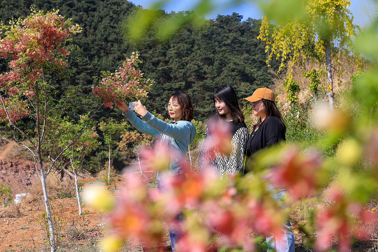 游客在河北省迁西县新庄子镇庚水田园文冠果园区赏花拍照。王爱军 摄