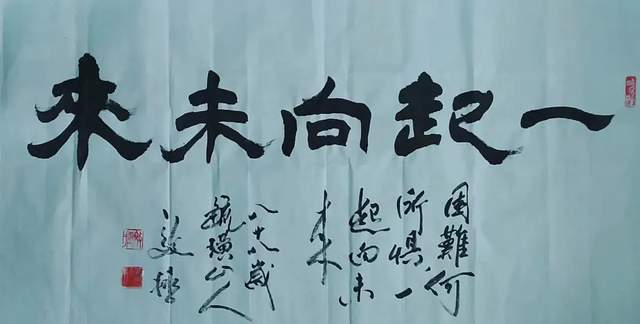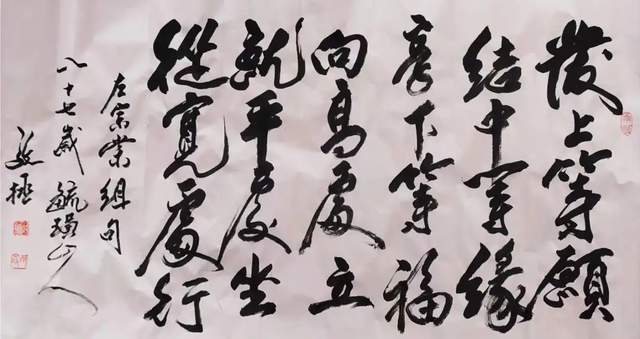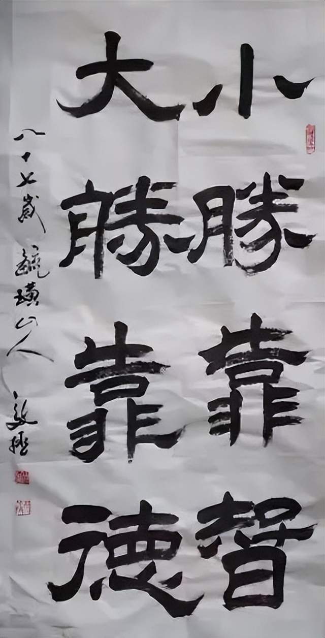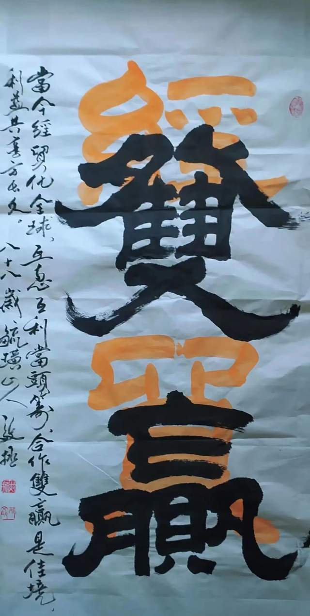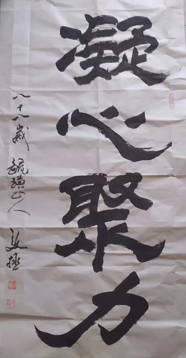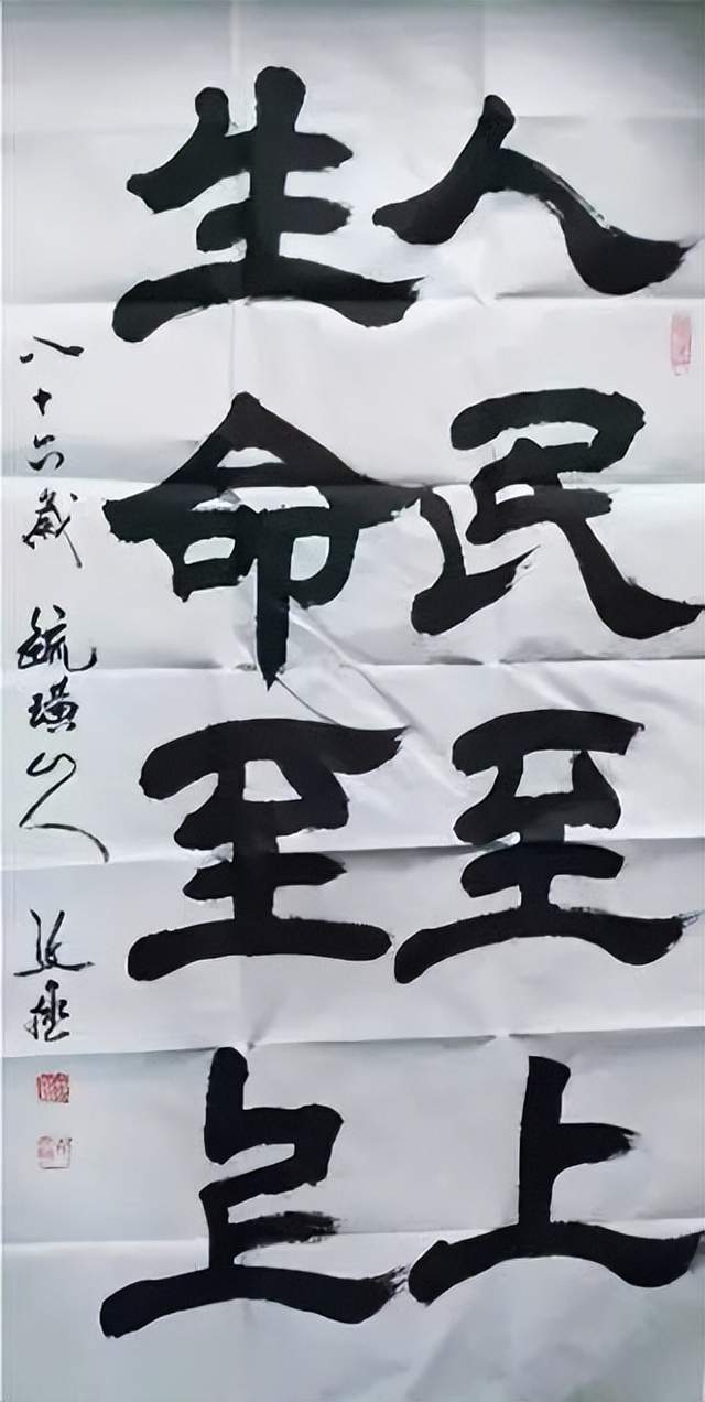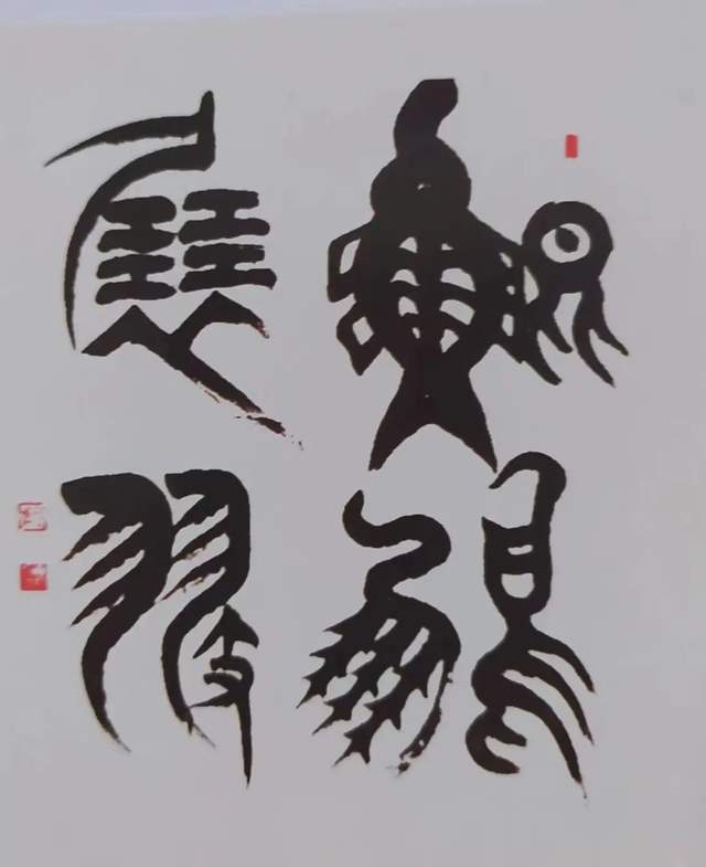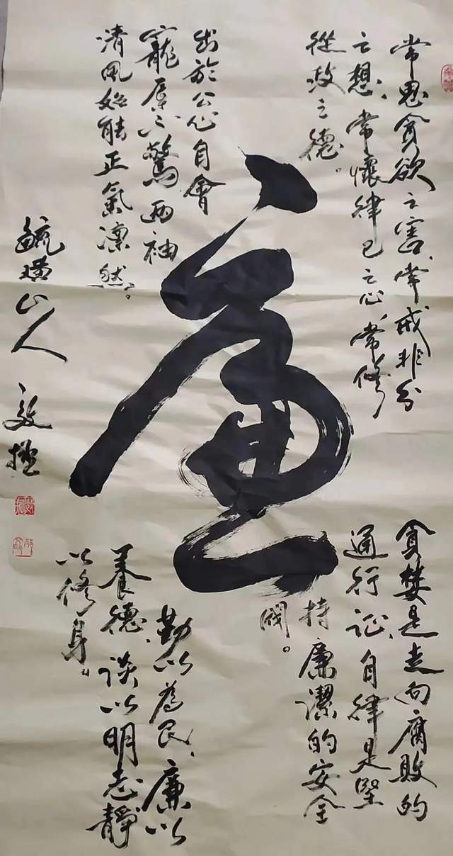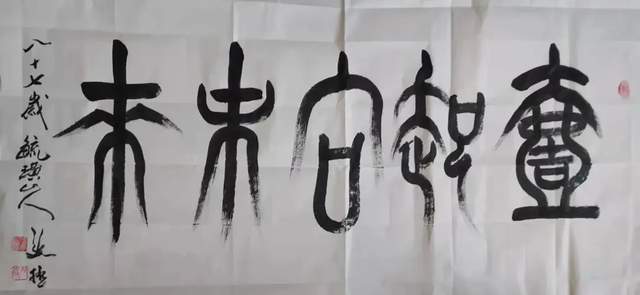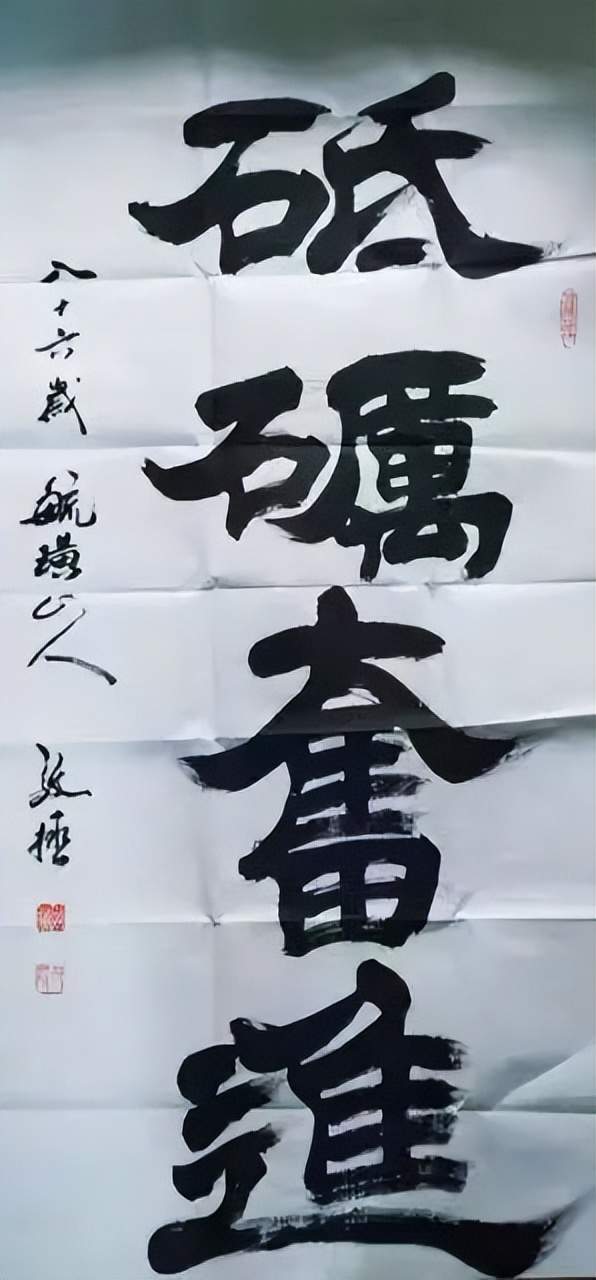 地位,但在实践中研究墨法的人并不多,通常说浓、淡、干、湿、枯的墨分五色,在一幅作品中都能展现出来是很难的。邴文政通过学习国画中的大泼墨法,在榜书书法创作中采用宿墨、水破墨、墨破水、宣纸溃水等国画大泼墨手法及笔法中采用偏锋、侧锋、拖笔等探索创作出了水墨榜书龙、虎、寿、荷、佛及六字之内短句书法。在独字中展现墨分五色,在点线中纵向、横向都有墨色变化。这种创作成功率很低,但邴文政确信在书法由应用功能向艺术书法转变中,应该探索的方向。