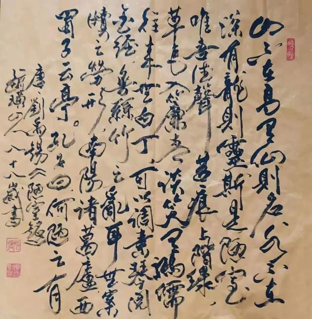 四是国学精典恢复原貌。近代在书法篆、隶、楷、行、草的基础上,又增加了甲骨文和简牘书法两种字体。邴文政对应年代,创作了仿龟甲的甲骨文易经乾挂。还创作了用老子、孔子当时的文字一一简书,老子道德经八十一章和论语名句选。为了当代人能读懂原文内容,并用小行书写译文,达到读懂国学精典的作用。五是围绕中华传统文化进行创作。中华传统文化很多,邴文政选择了寿文化、龙文化、福文化、道教文化、佛教文化、酒文化、龙凤等图腾文化、诗词文化等进行创作。也常以中华传统文化配自作诗词进行创作,使其传统文化和当代结合,达到古为今用的目的。