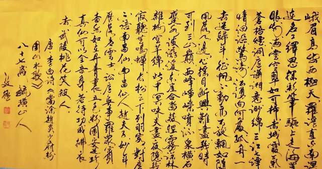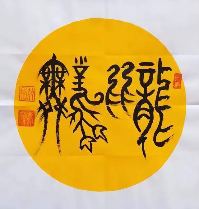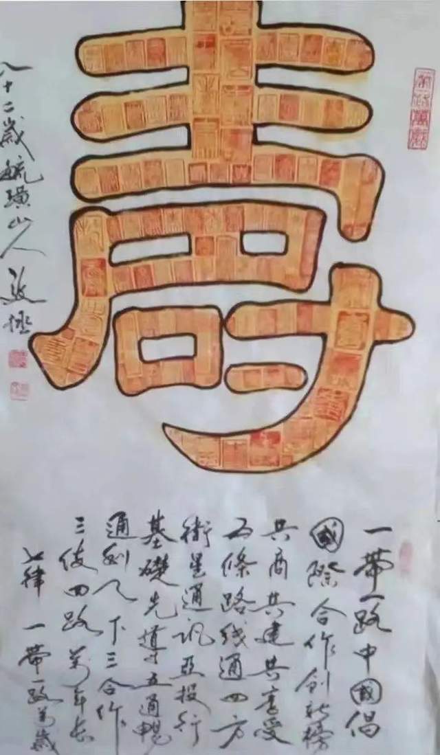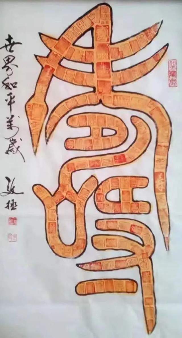 二是集字书法。中国汉字无论是数量、异体字及字体都特别丰富。一个汉字从甲骨文到简化字最少有几十种写法,最多的如寿字有几千种写法。这是一个文化艺术的资源,集合起来就是美的艺术。开始以阵列式写了二百幅百寿图,后来又挖掘出了龙、虎、凤、福...采取阵列式、繁星式、立体三维式、成语式、组句式母子式等。创作出了乐园、醉仙、星舞、鹰击长空、凤还巢、农家乐、八仙过海、十面埋伏,耕云种月等几十种不同的作品。力图提高书法的趣味,使其成为书法艺术。