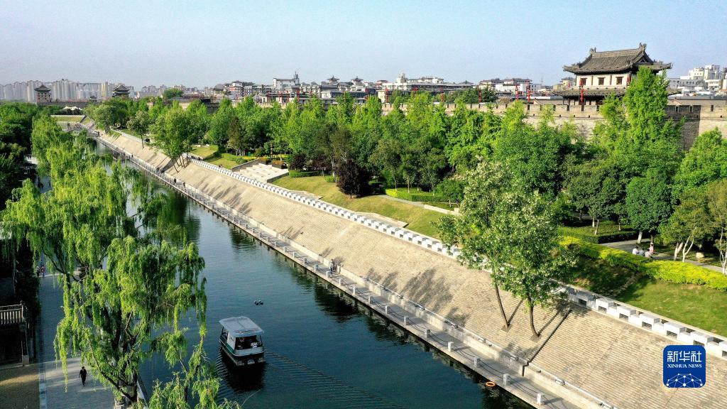 西安明城墙西侧护城河(无人机照片)。新华社记者 刘潇 摄