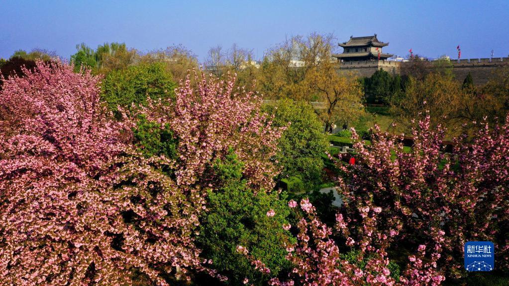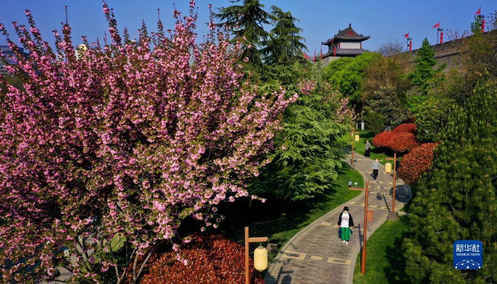 西安明城墙下春花盛开(无人机照片)。新华社记者 刘潇 摄