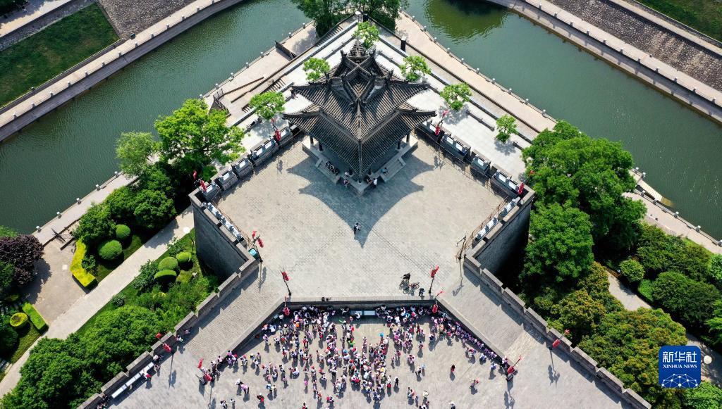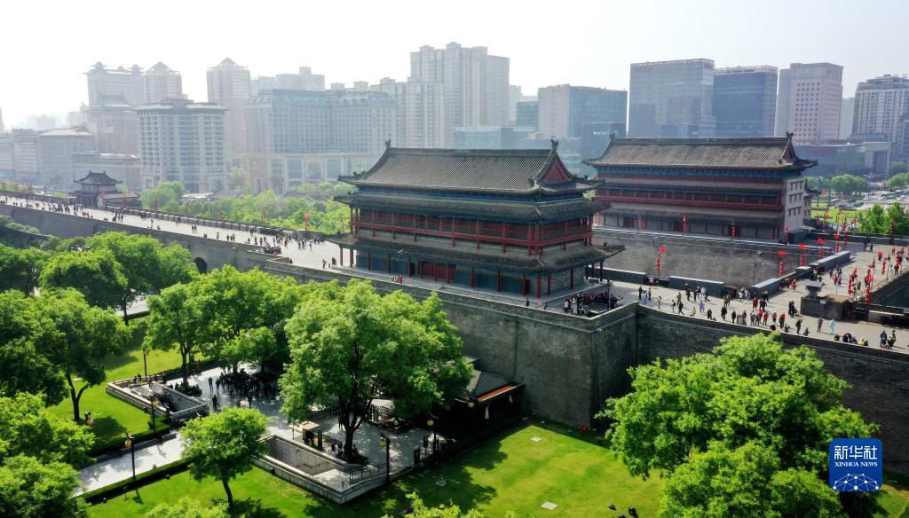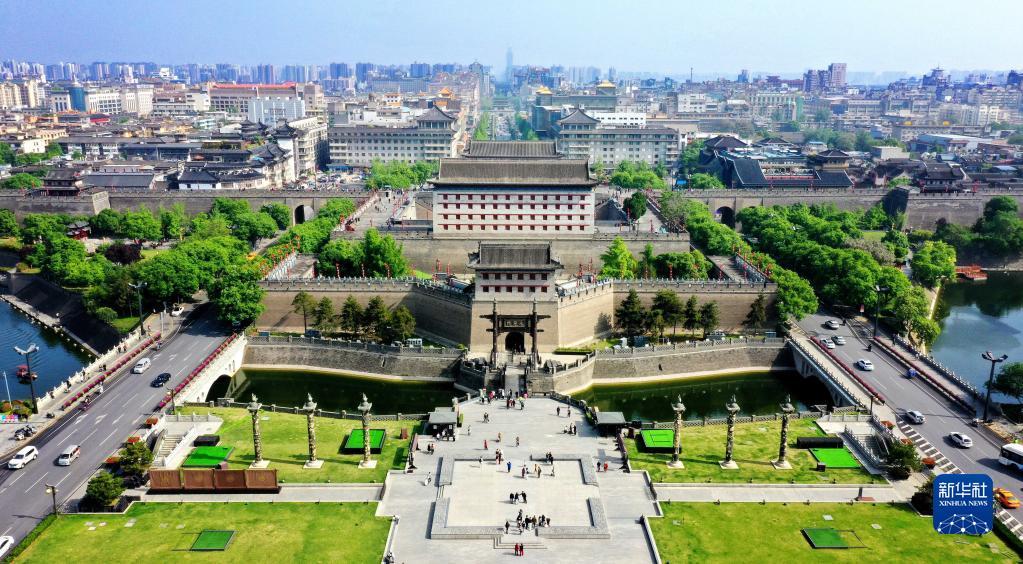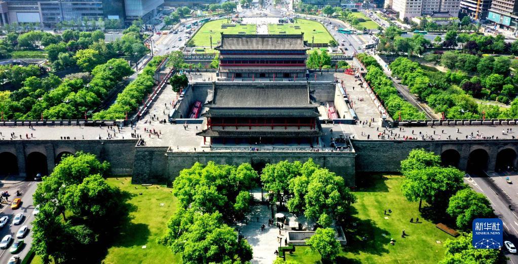 春和景明,万物昭苏,陕西西安明城墙被郁郁葱葱的绿植及绚丽多彩的春花装点一新,成为市民及游客踏春赏景的好去处。图为西安明城墙永宁门(无人机照片)。新华社记者 刘潇 摄