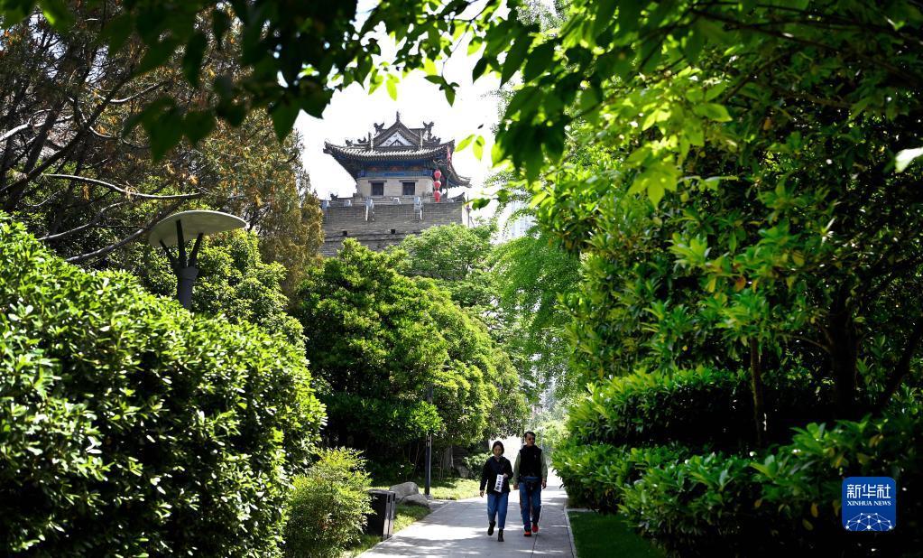 市民在西安明城墙下的环城公园内散步。新华社发(邹竞一 摄)