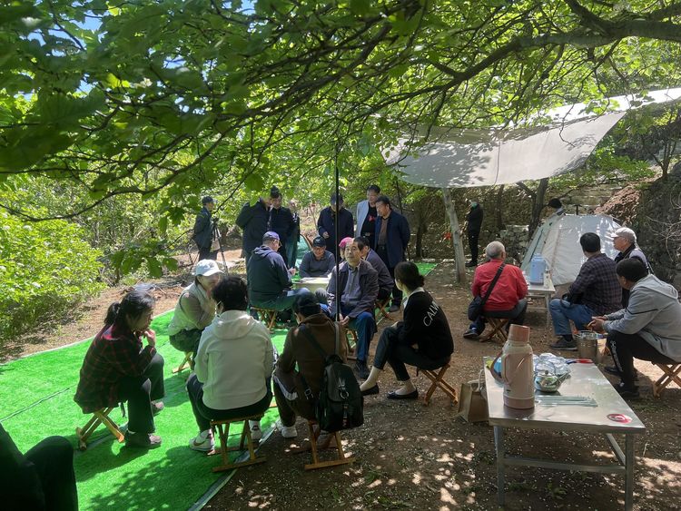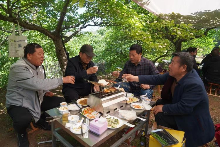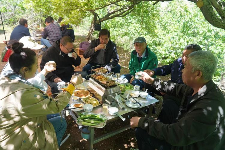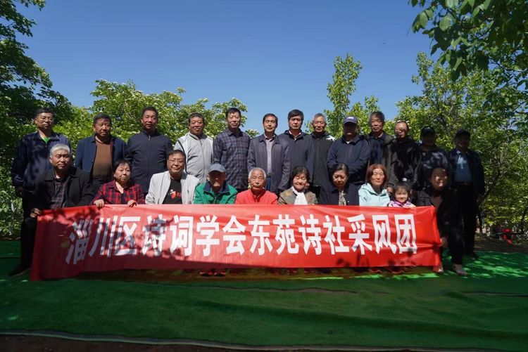 2023年4月28日,春光明媚,山楂花盛开。正是淄博烧烤“爆火”之际,淄川区寨里镇甘泉村山里红生态园正式开业了。很多老朋友、老乡亲聚集在扎山北坡山楂树下品尝烧烤美味。甘泉村建有“扎山诗社”,还是市级诗词单位,村书记就是诗社社长,区诗词学会理所当然要来助力。部分诗友应邀前来参加活动,为“撸串儿”增添诗词智慧和力量。